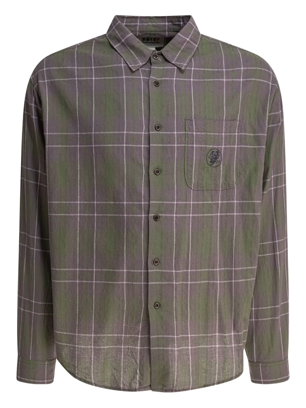 Вышитый узор в зеленую клетку, застежка на пуговицы, длинные рукава, нагрудный карман.