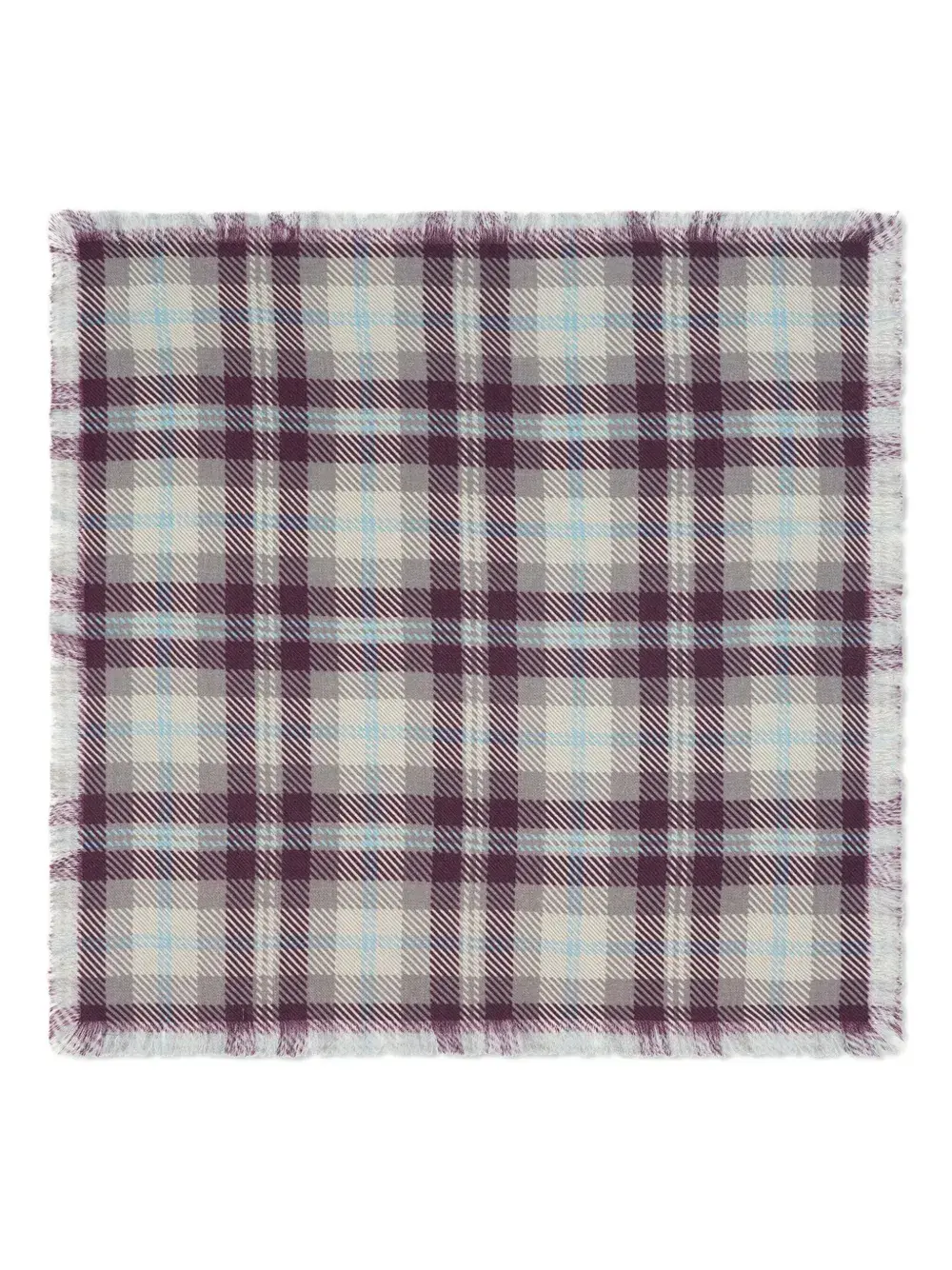 Кашемир квадратной формы с бахромой по краям и узором в фиолетовую клетку