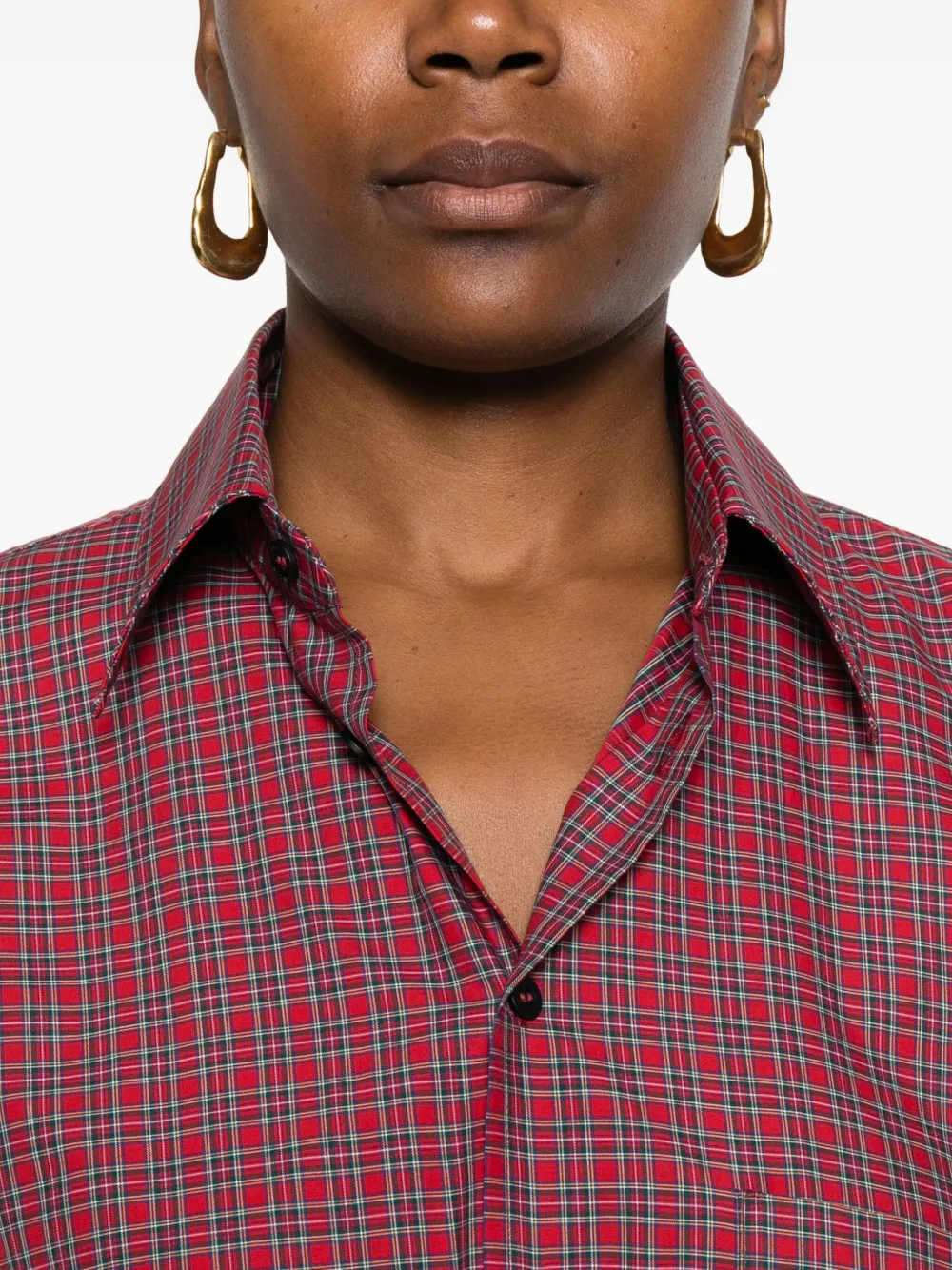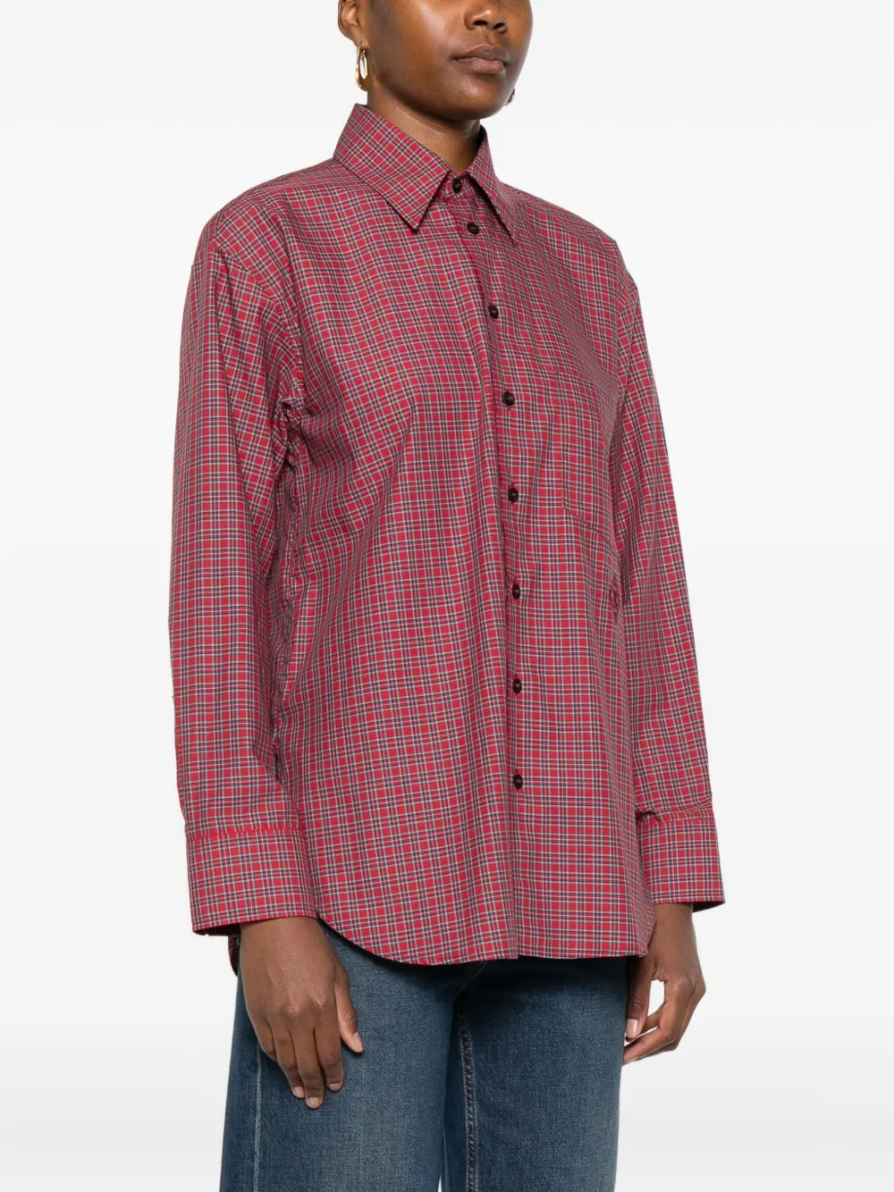 Розовый клетчатый узор, застежка на пуговицы, длинные рукава, вышитый логотип.