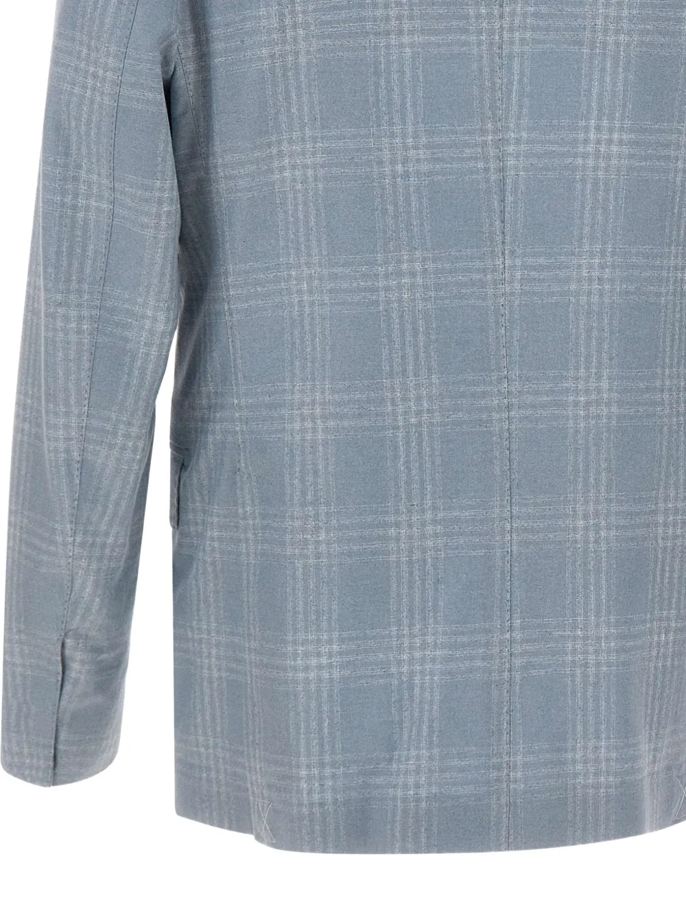 Карманы с клапанами в клетку голубого цвета, застежка на три пуговицы, нагрудный карман, шлицы сзади