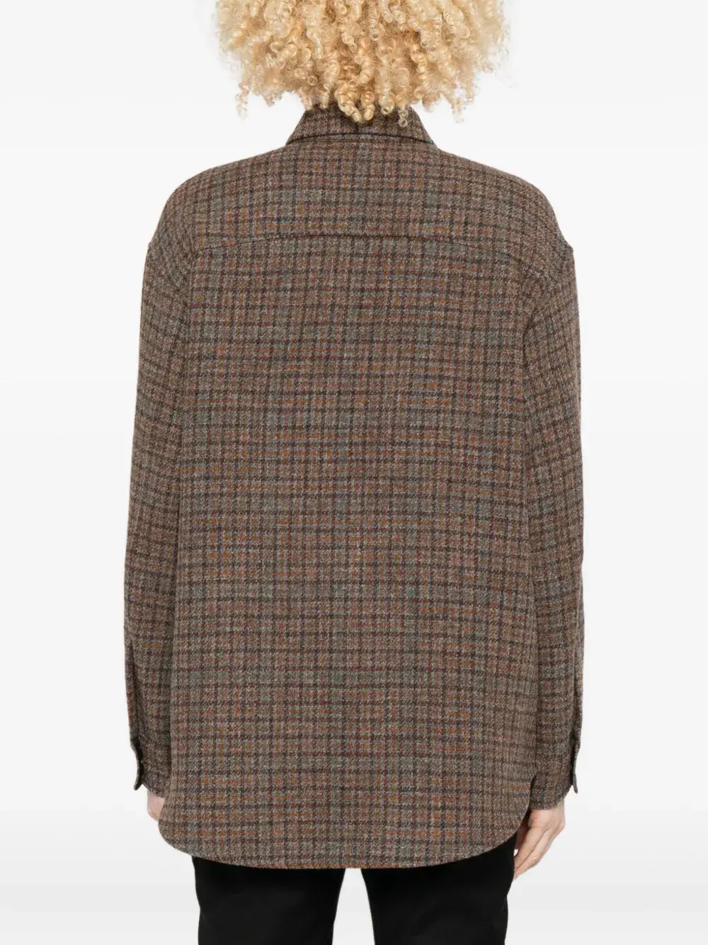 Коричневый клетчатый узор, застежка на пуговицы, длинные рукава, карманы с клапанами.