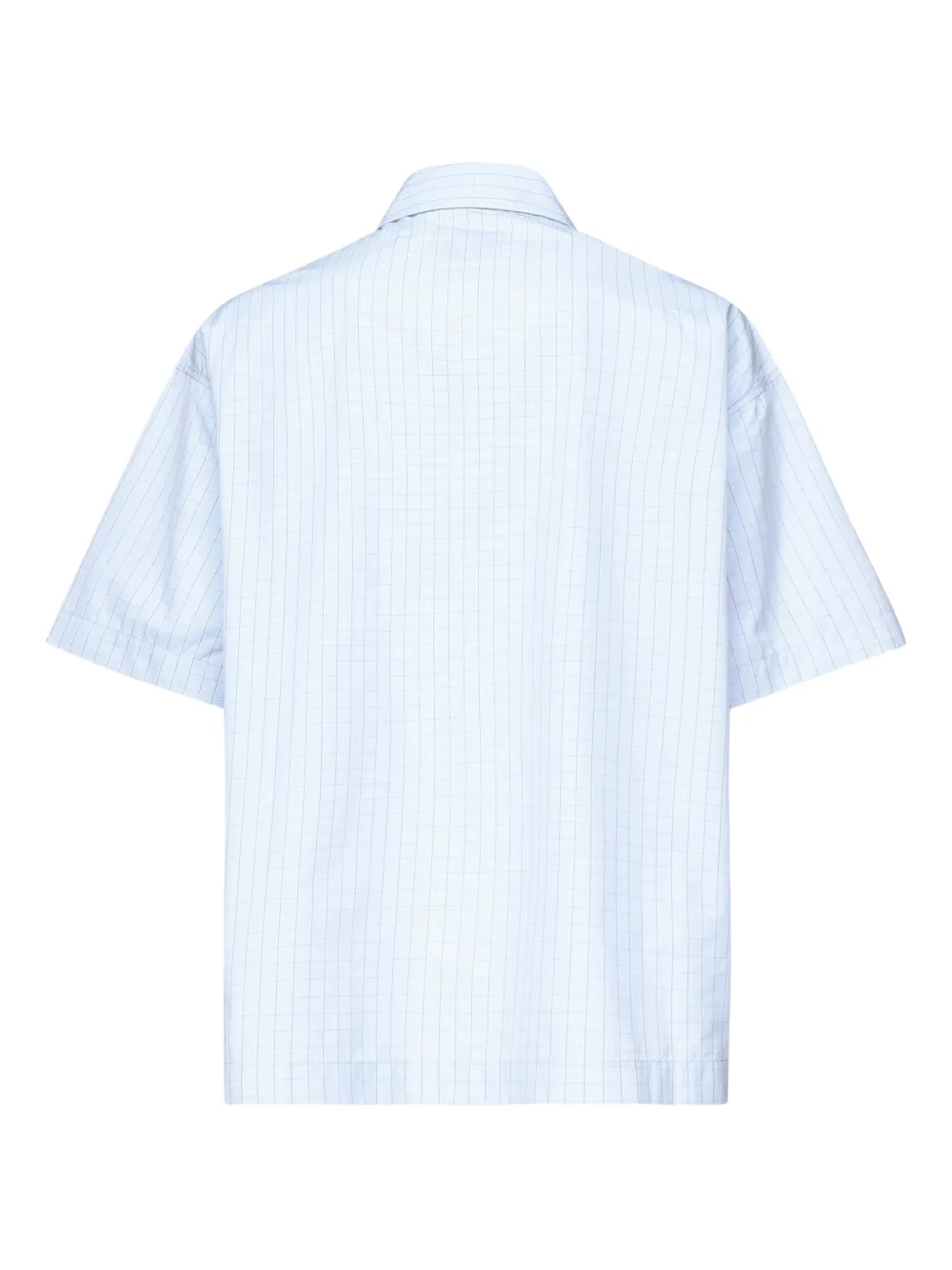 Светло-голубой сетчатый узор, короткие рукава, застежка на пуговицы, нагрудный карман, воротник-стойка.