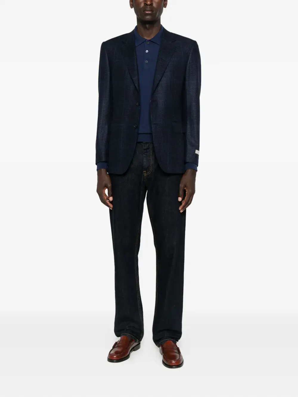 Однобортный пиджак с клетчатым узором темно-синего цвета, застежка на лацкан с клапанами, длинные рукава