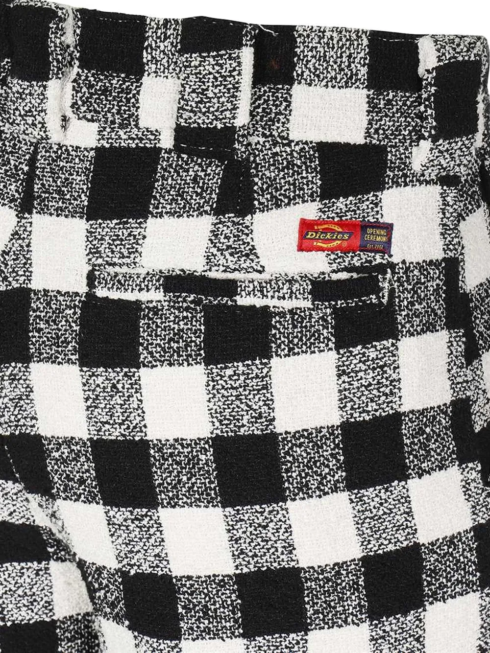 Узор в черно-белую клетку, застежка на крючок и молнию спереди, шлевки для ремня, прямой крой