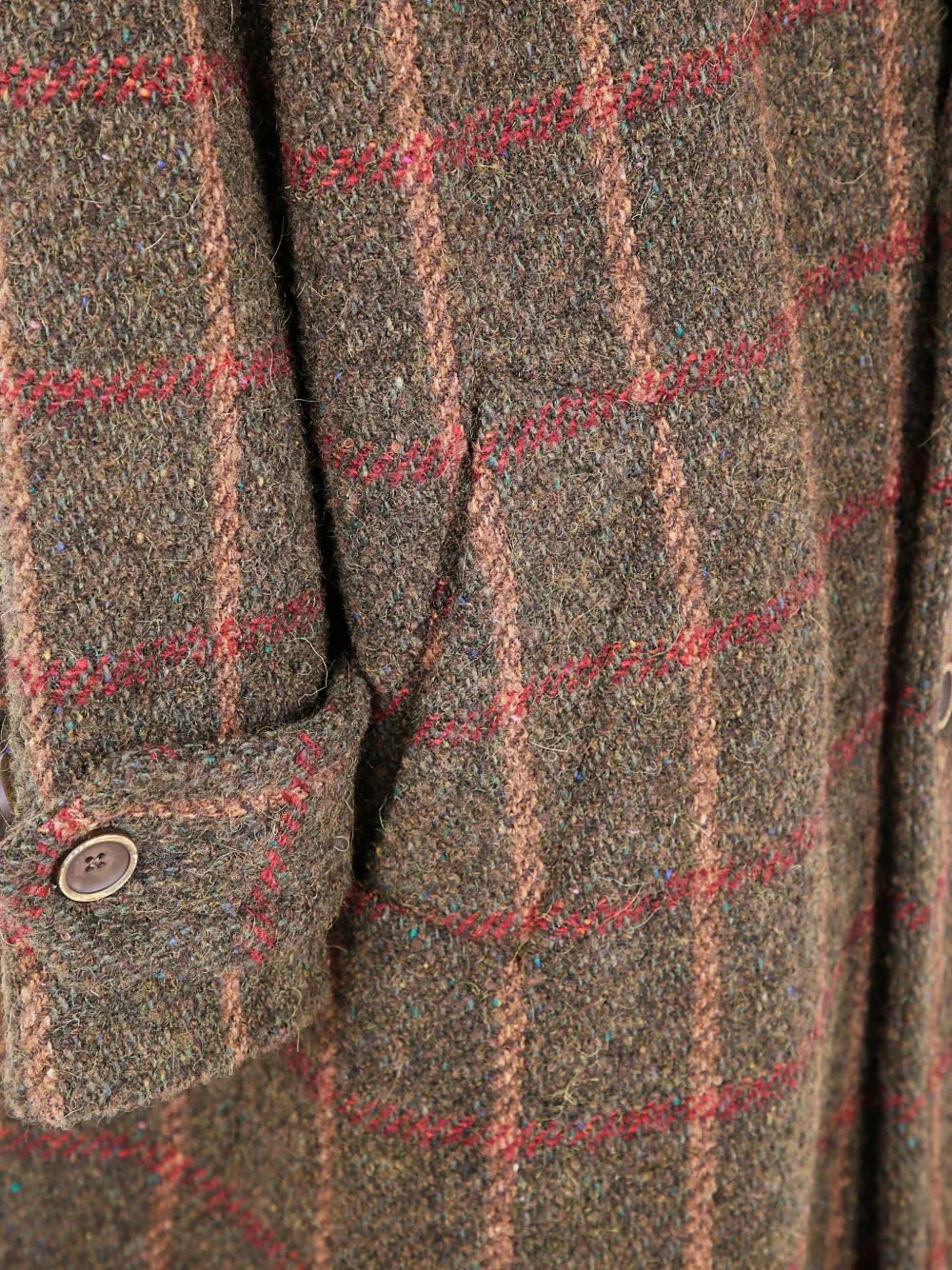 Коричневый клетчатый узор, застежка на пуговицы, длинные рукава, отвороты на манжетах.