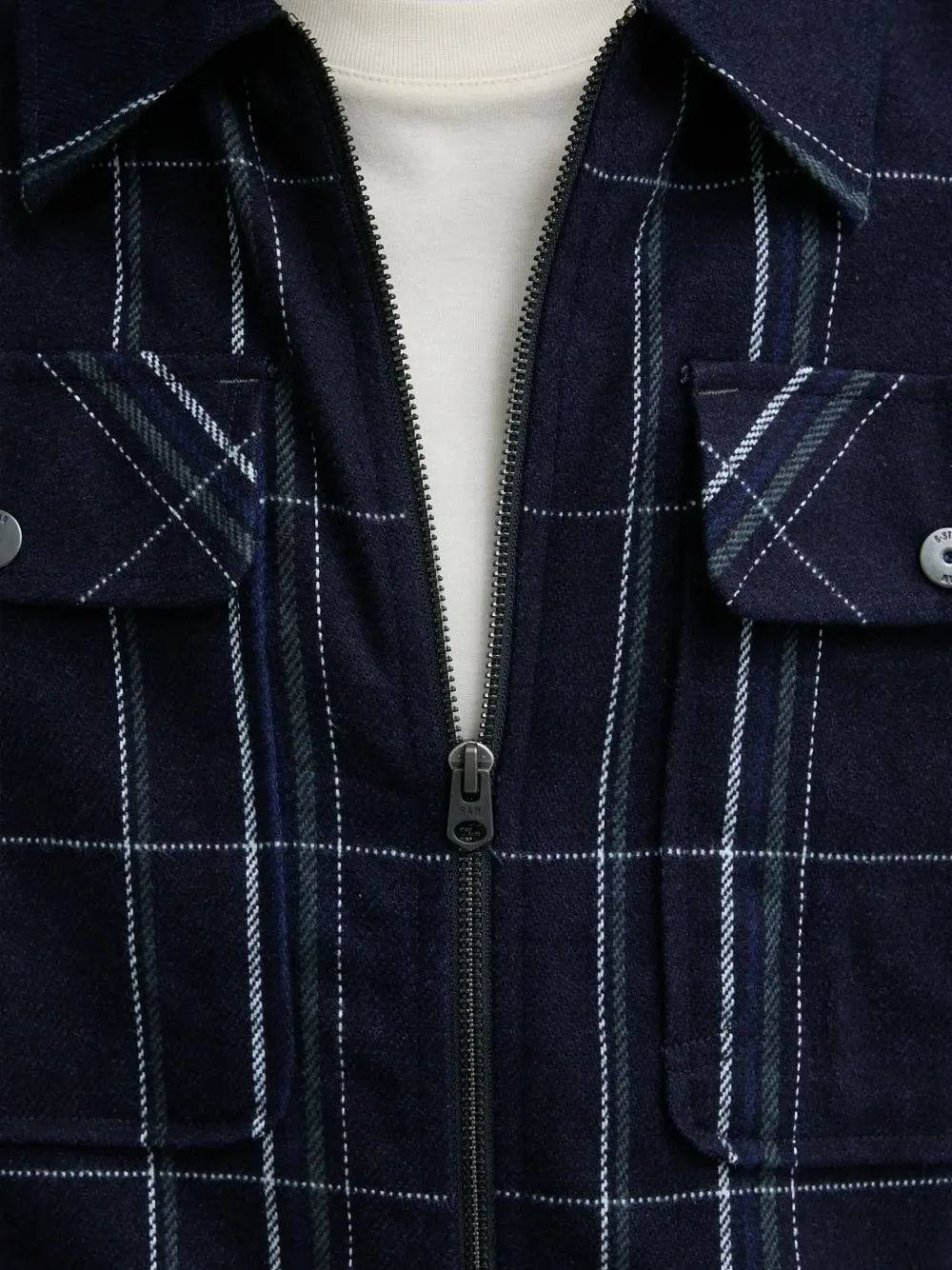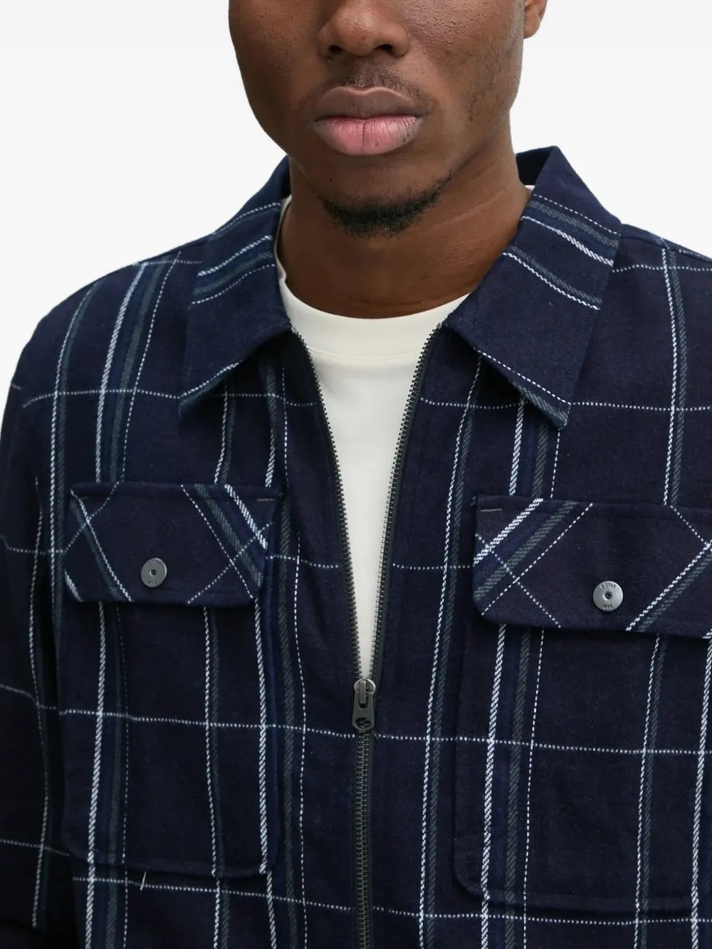 Темно-синий клетчатый узор, застежка-молния спереди, нагрудные карманы с клапанами, длинные рукава, манжеты на пуговицах
