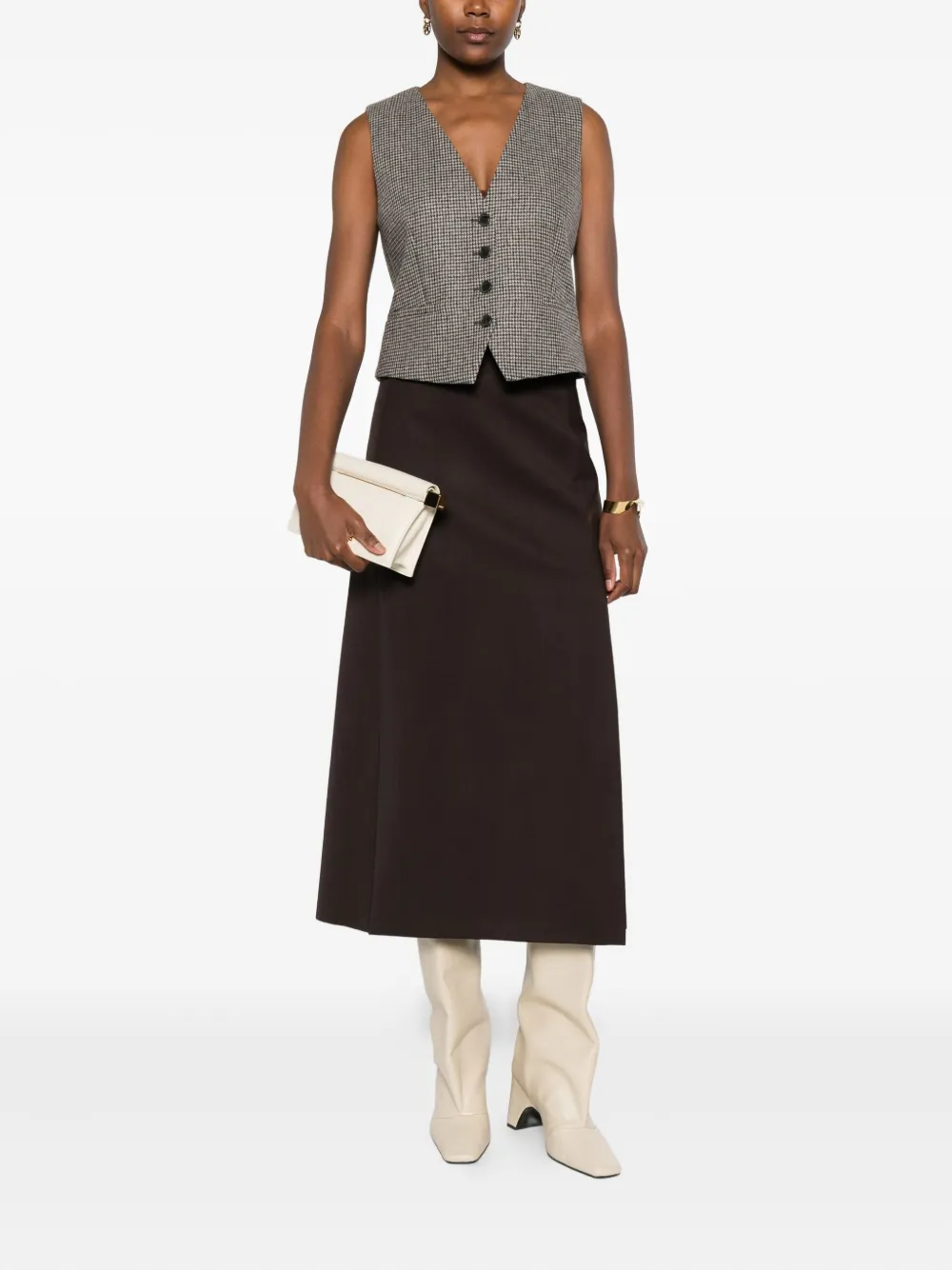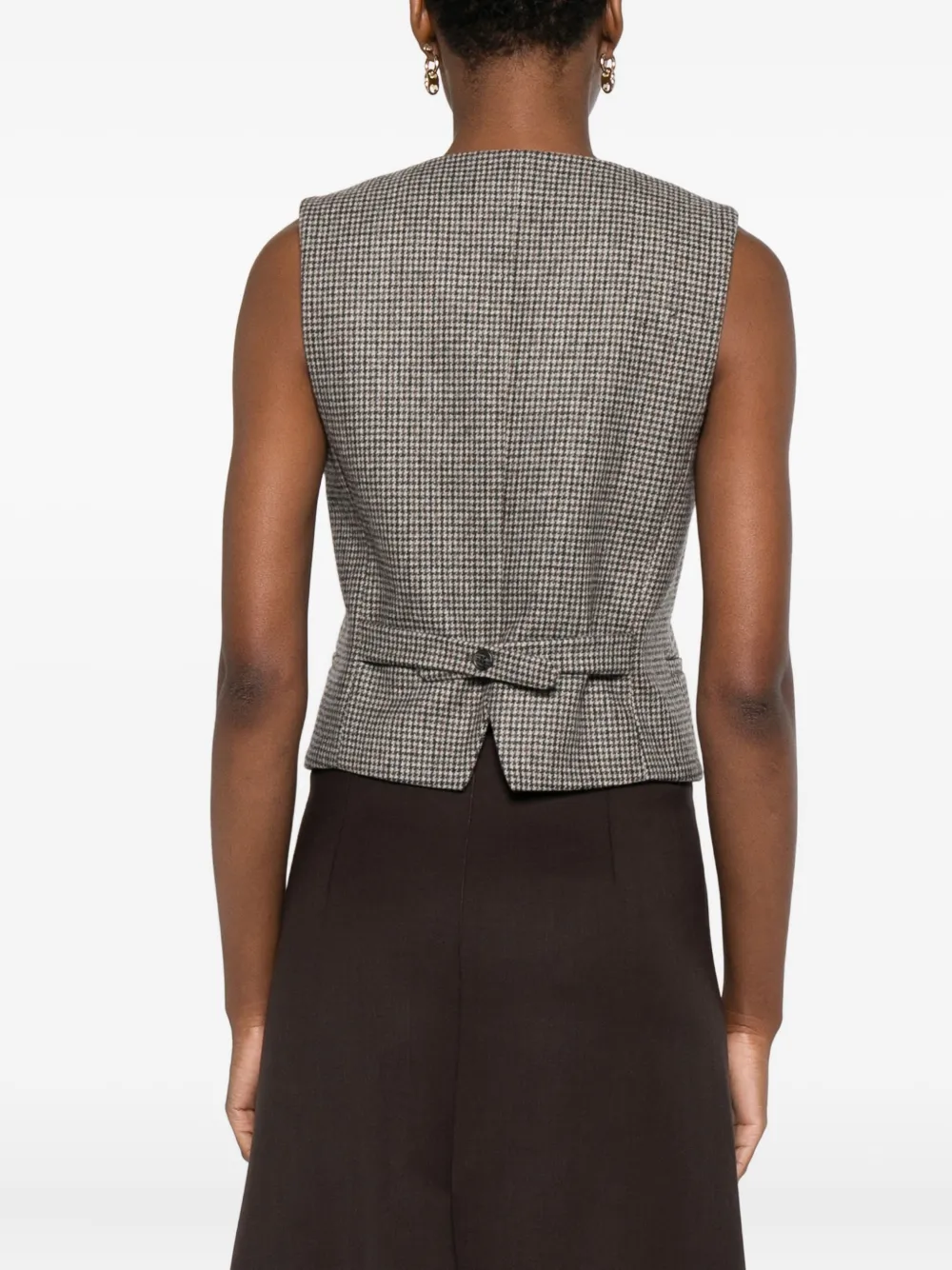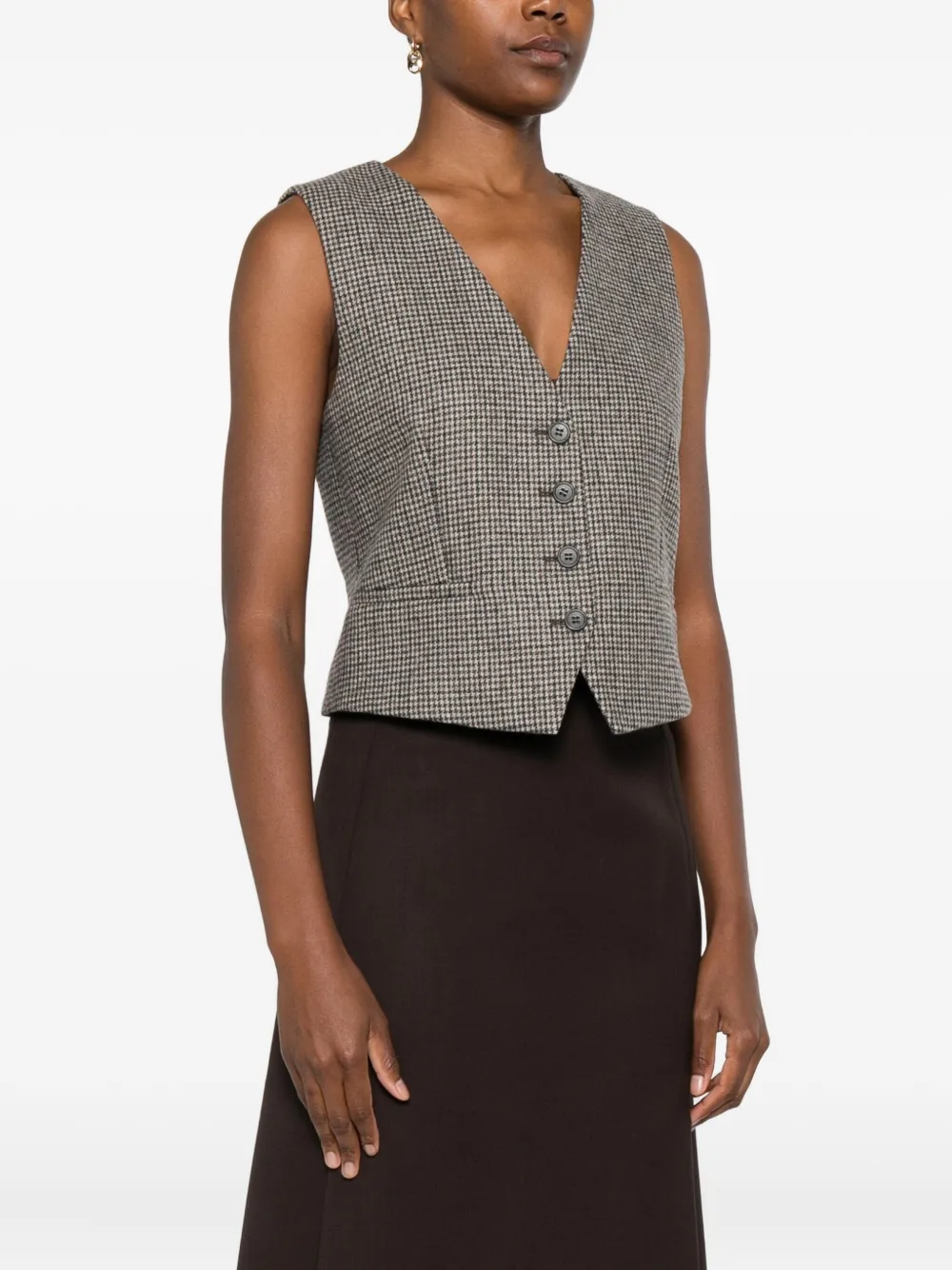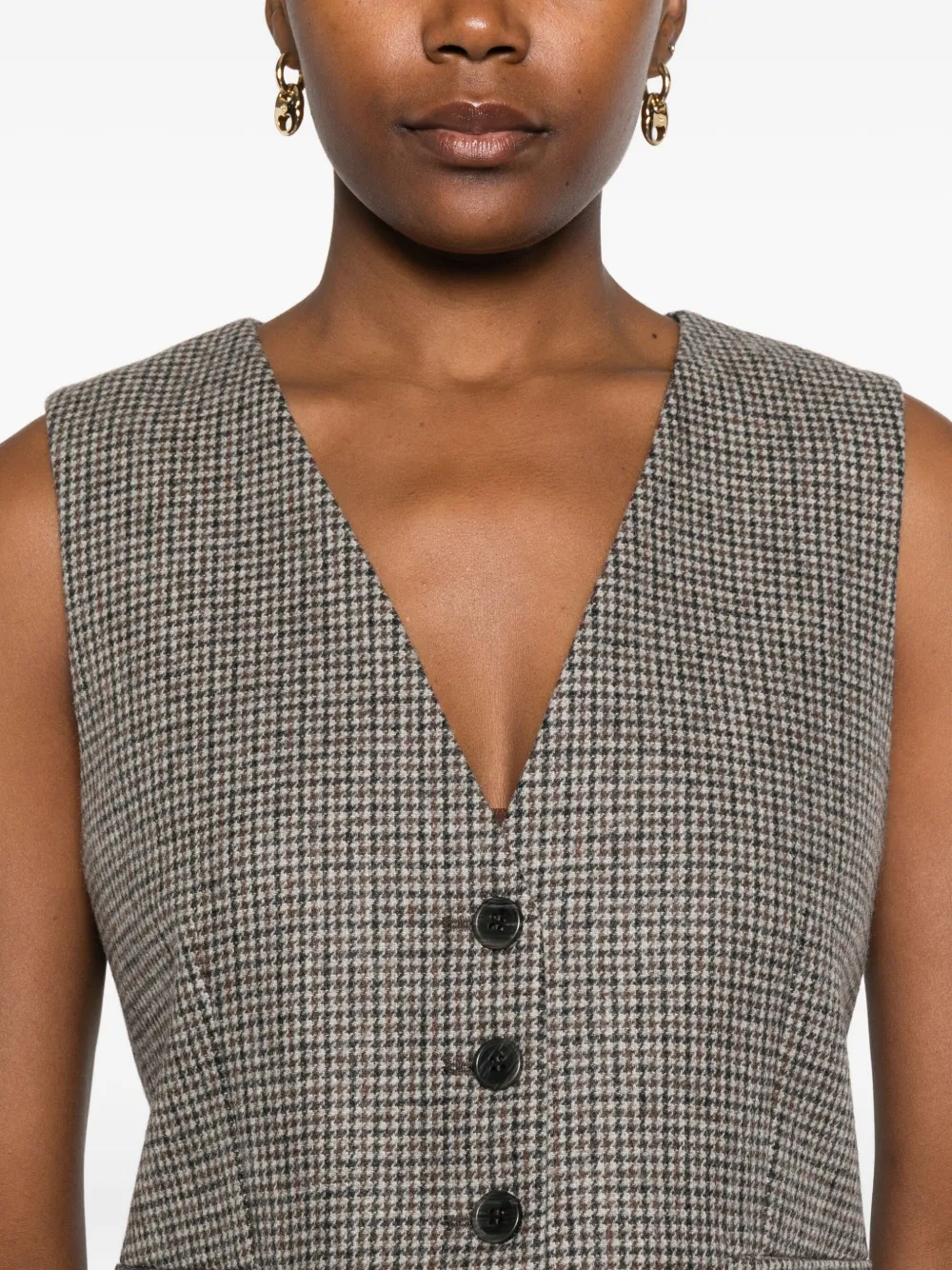 Коричневая клетчатая безрукавка с V-образным вырезом, застежка на пуговицы.