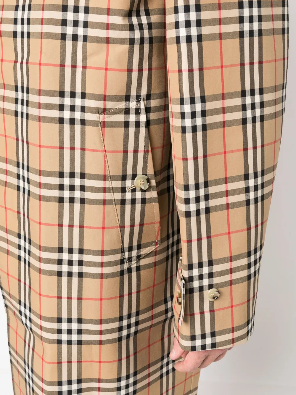 Бежевый, хлопок, клетчатый узор, прямой воротник, потайная пуговичная застежка спереди, длинные рукава, манжеты на пуговицах, длина ниже колена и прямой подол.