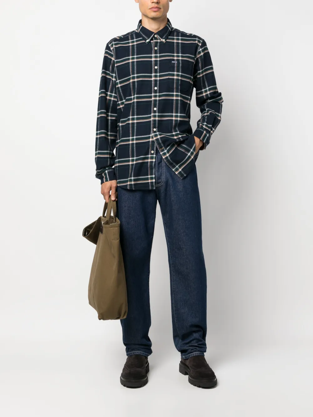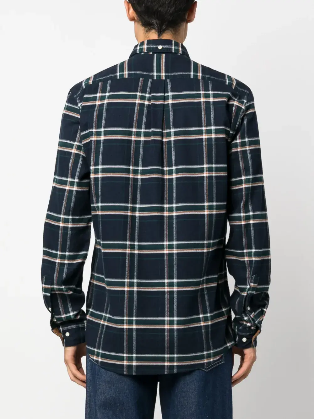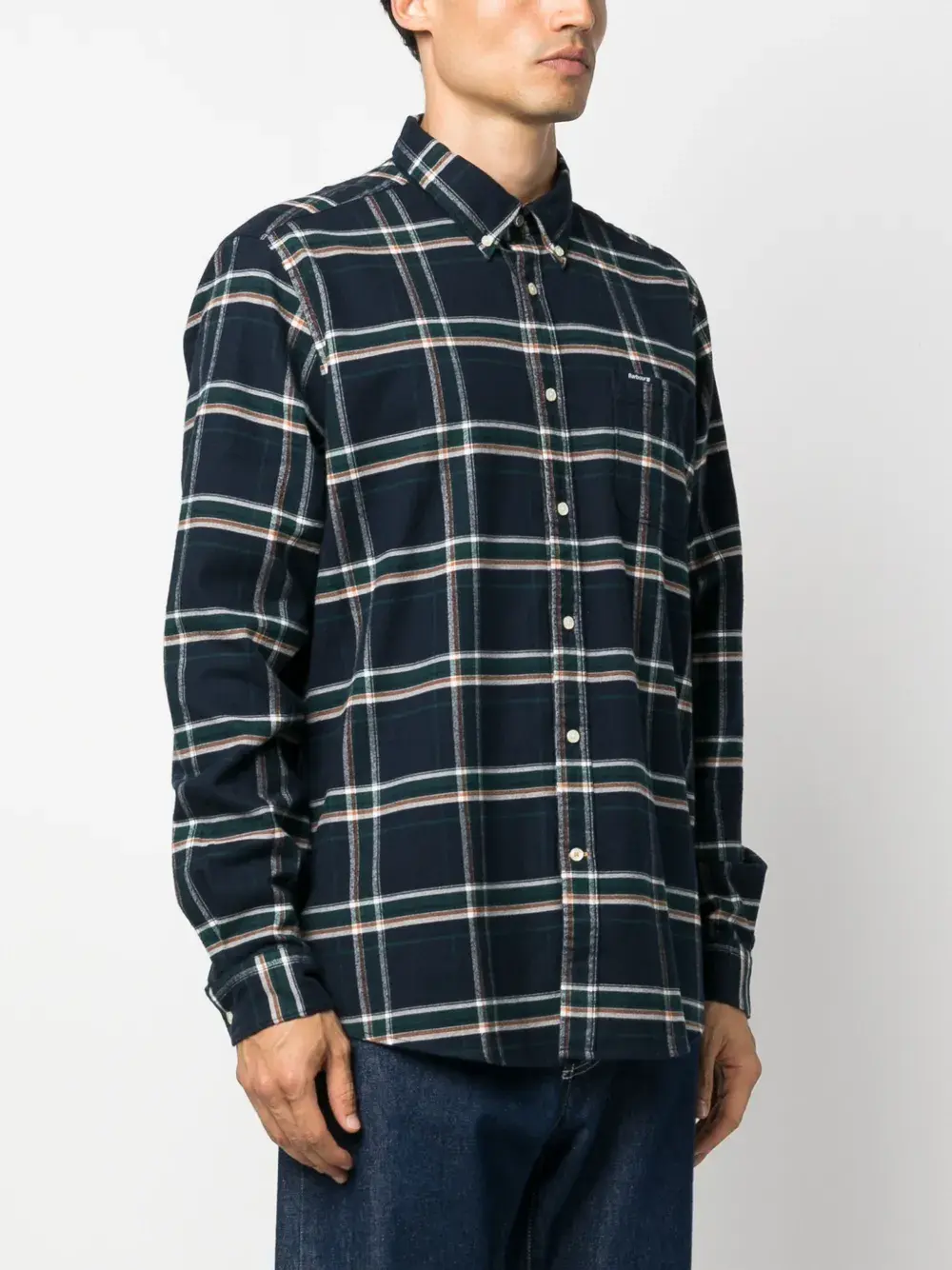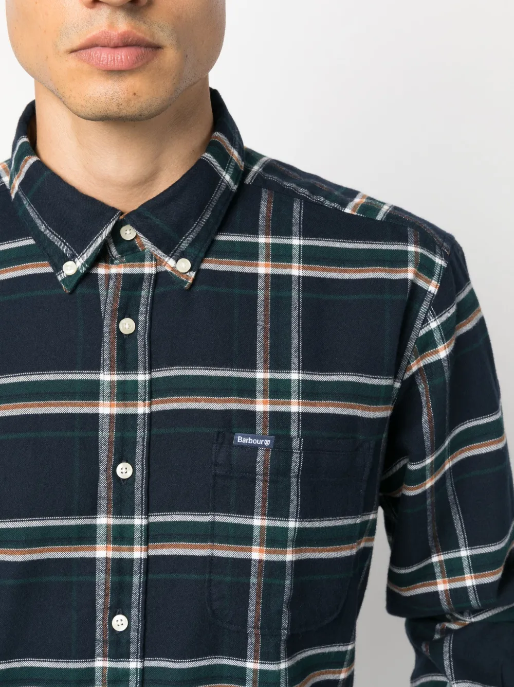 Принт в клетку, маленькая подвеска с логотипом, воротник на пуговицах, застежка на пуговицах спереди, длинные рукава, манжеты на пуговицах, нагрудный накладной карман и закругленный подол.