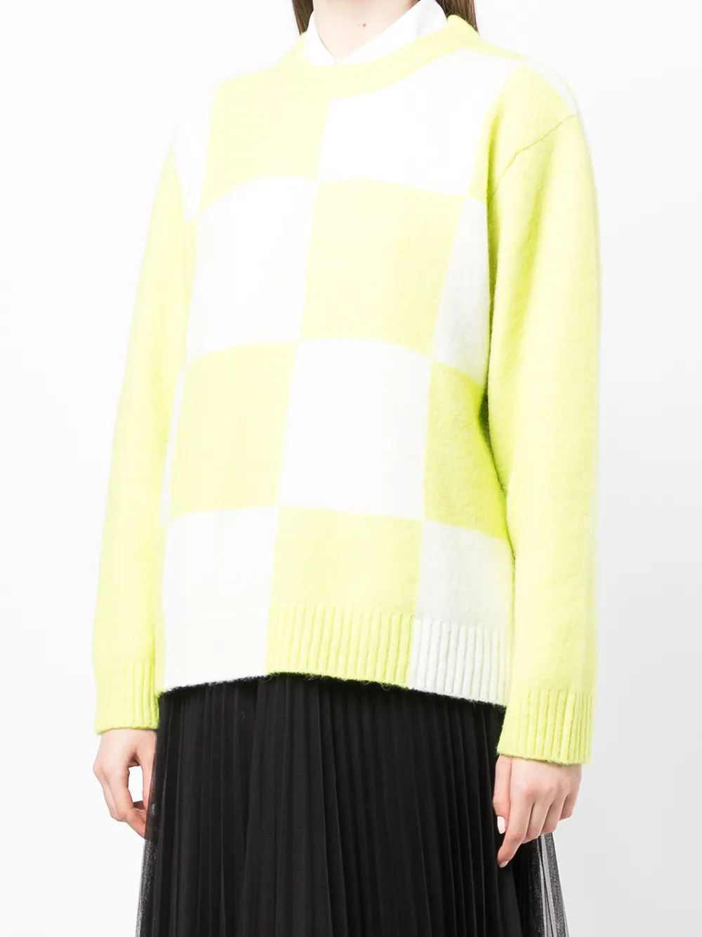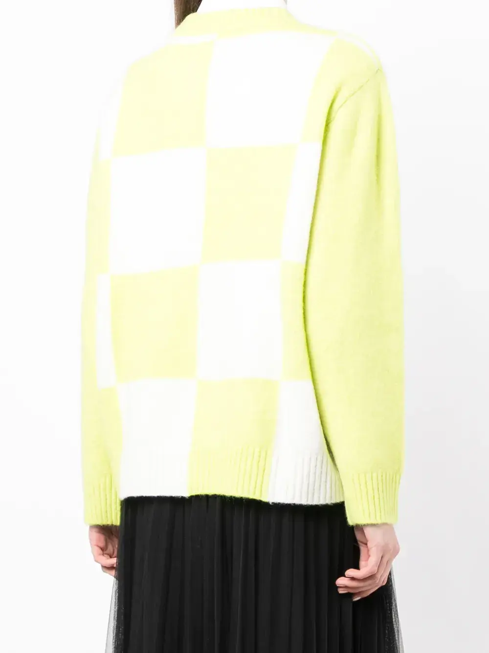Клетчатый узор, круглый вырез, длинные рукава, приспущенные плечи, манжеты в рубчик и подол в рубчик.
