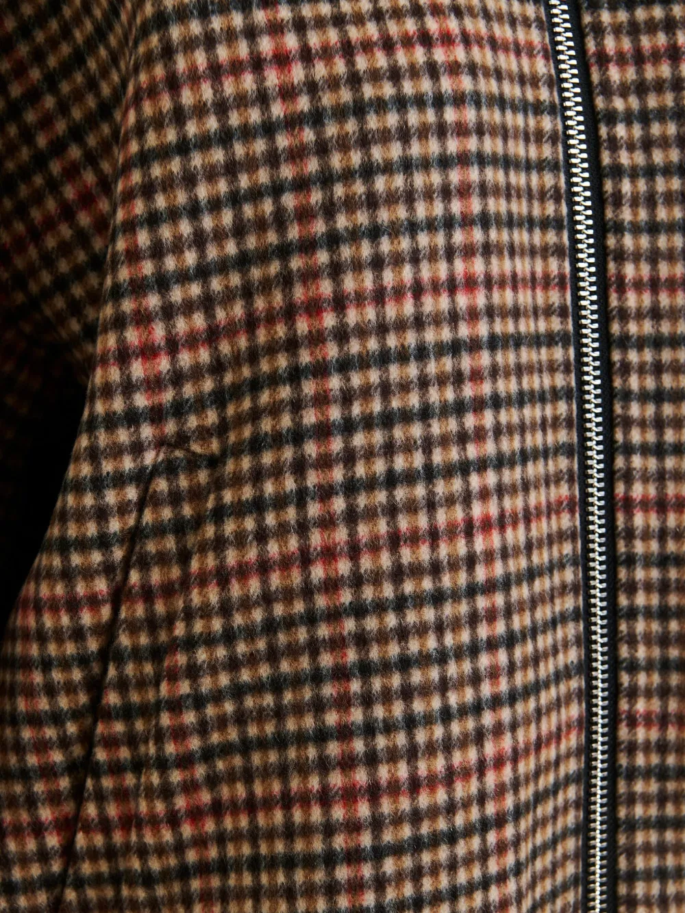 Коричневая шерсть, застежка-молния по всей длине, спущенные плечи, косые боковые карманы, клетчатый узор.