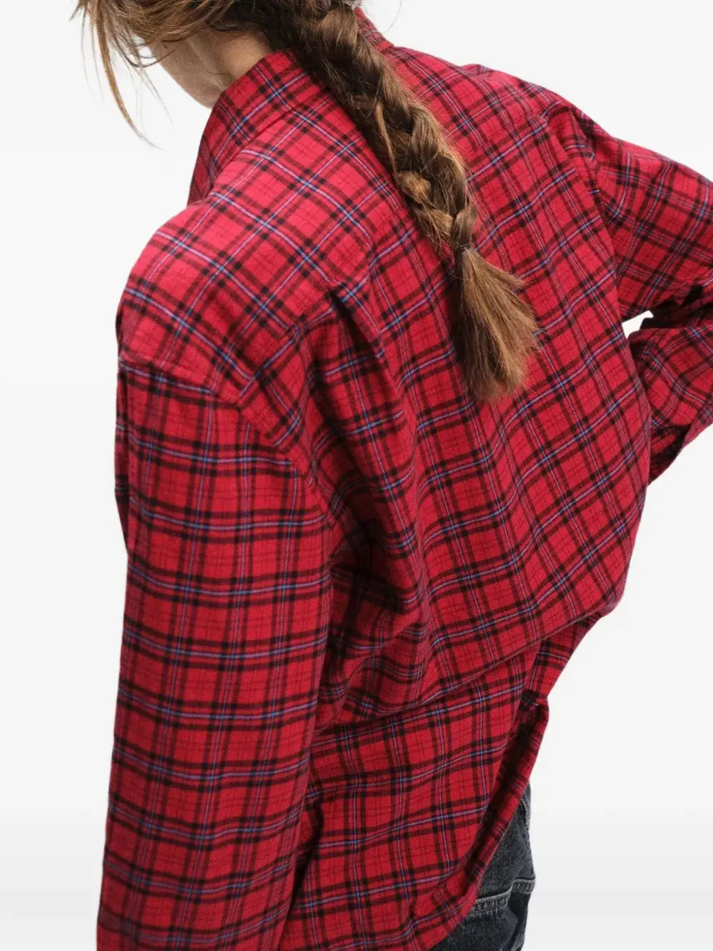 Красный клетчатый узор, длинные рукава, застежка на пуговицы, карман с клапаном, воротник-поло