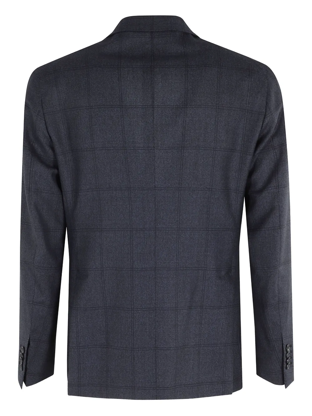 Синий клетчатый узор, застежка на пуговицы, накладные карманы, острые лацканы
