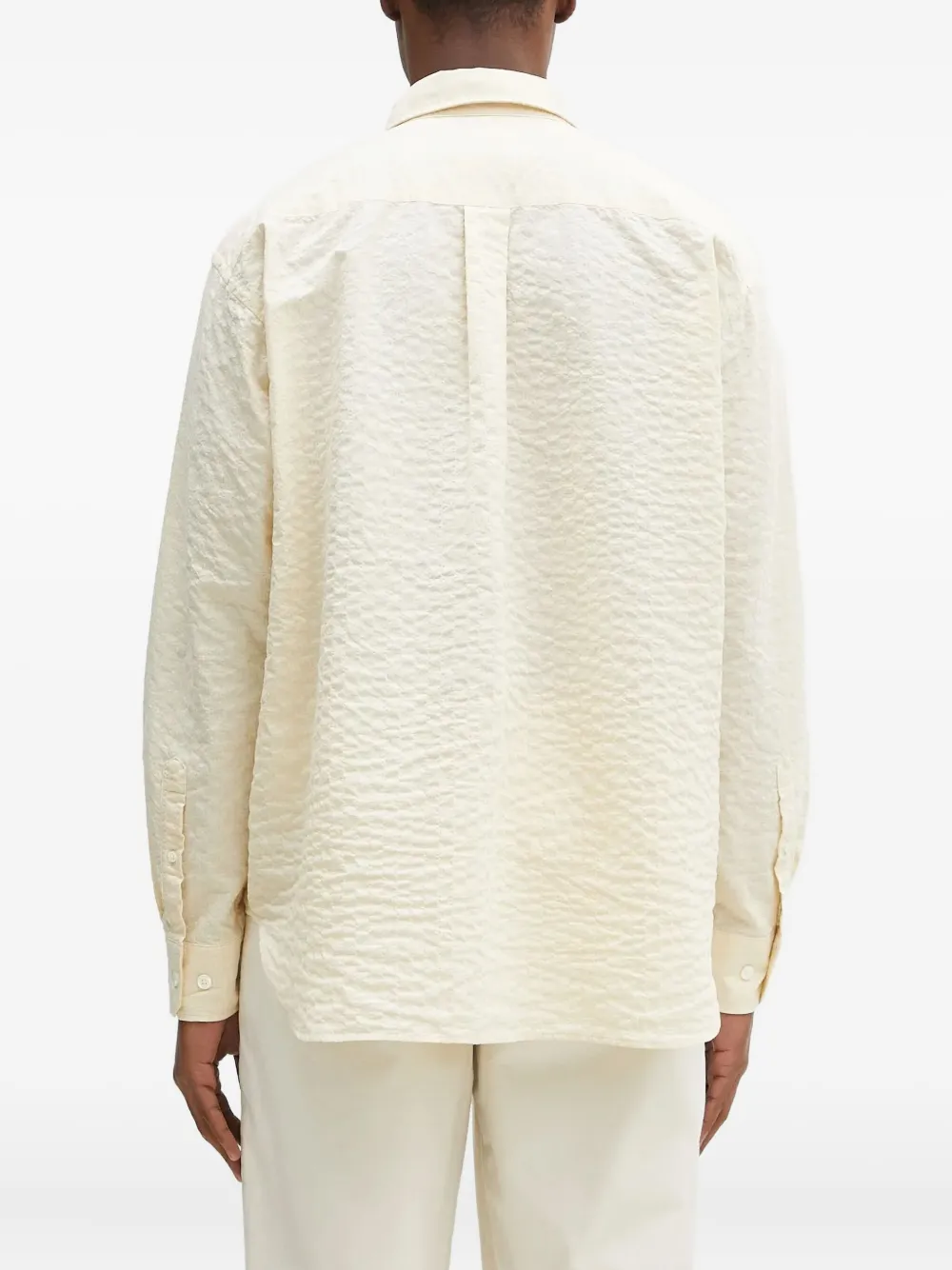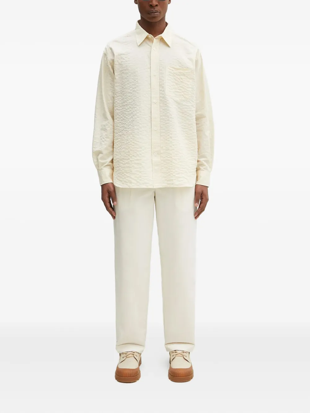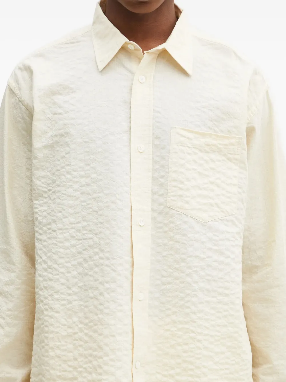 Текстурированная ткань кремового цвета, застежка на пуговицы, длинные рукава, классический воротник, нагрудный карман