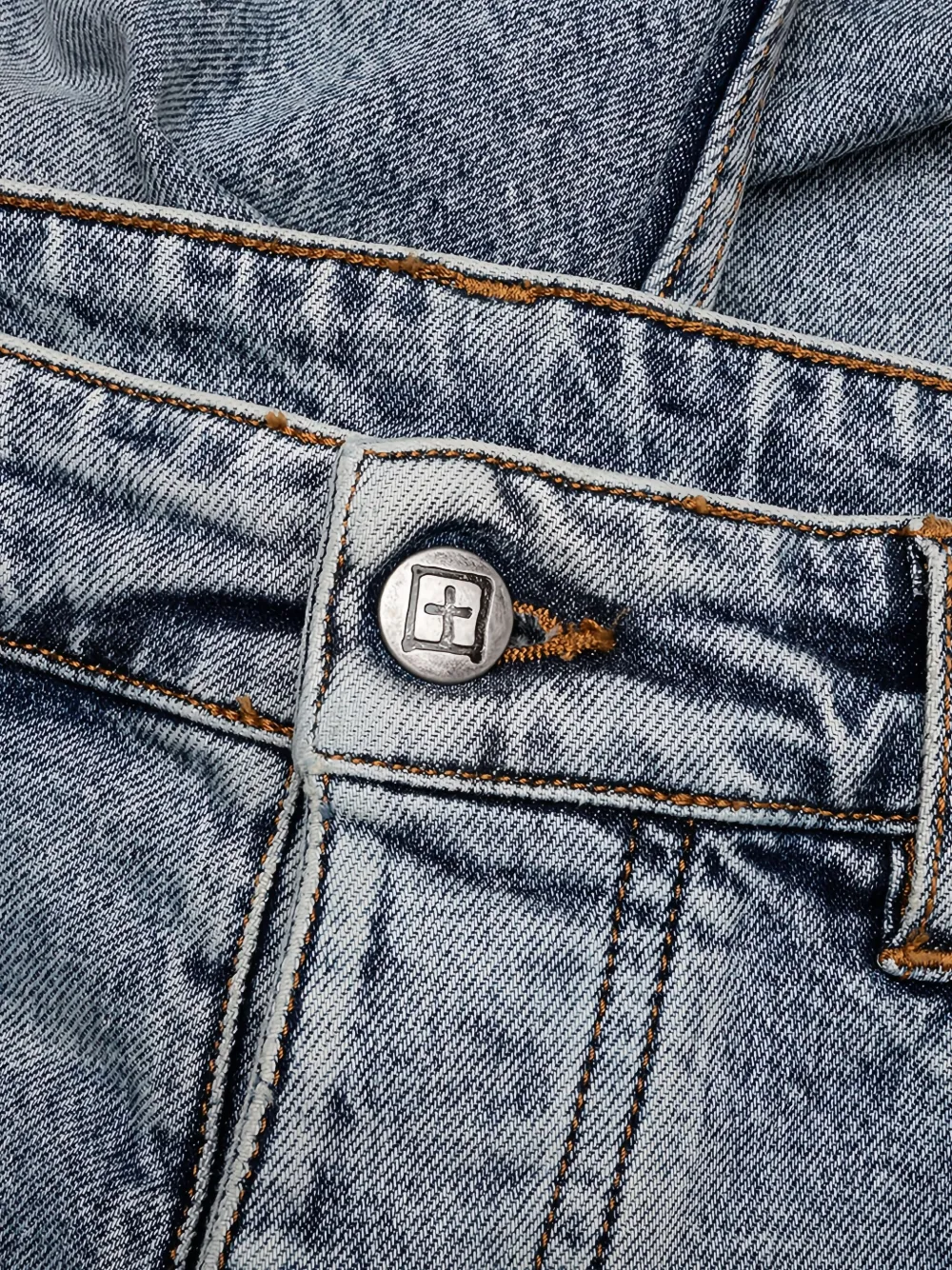 Светло-голубой необработанный край, застежка на пуговицы сзади, пять карманов, контрастная строчка