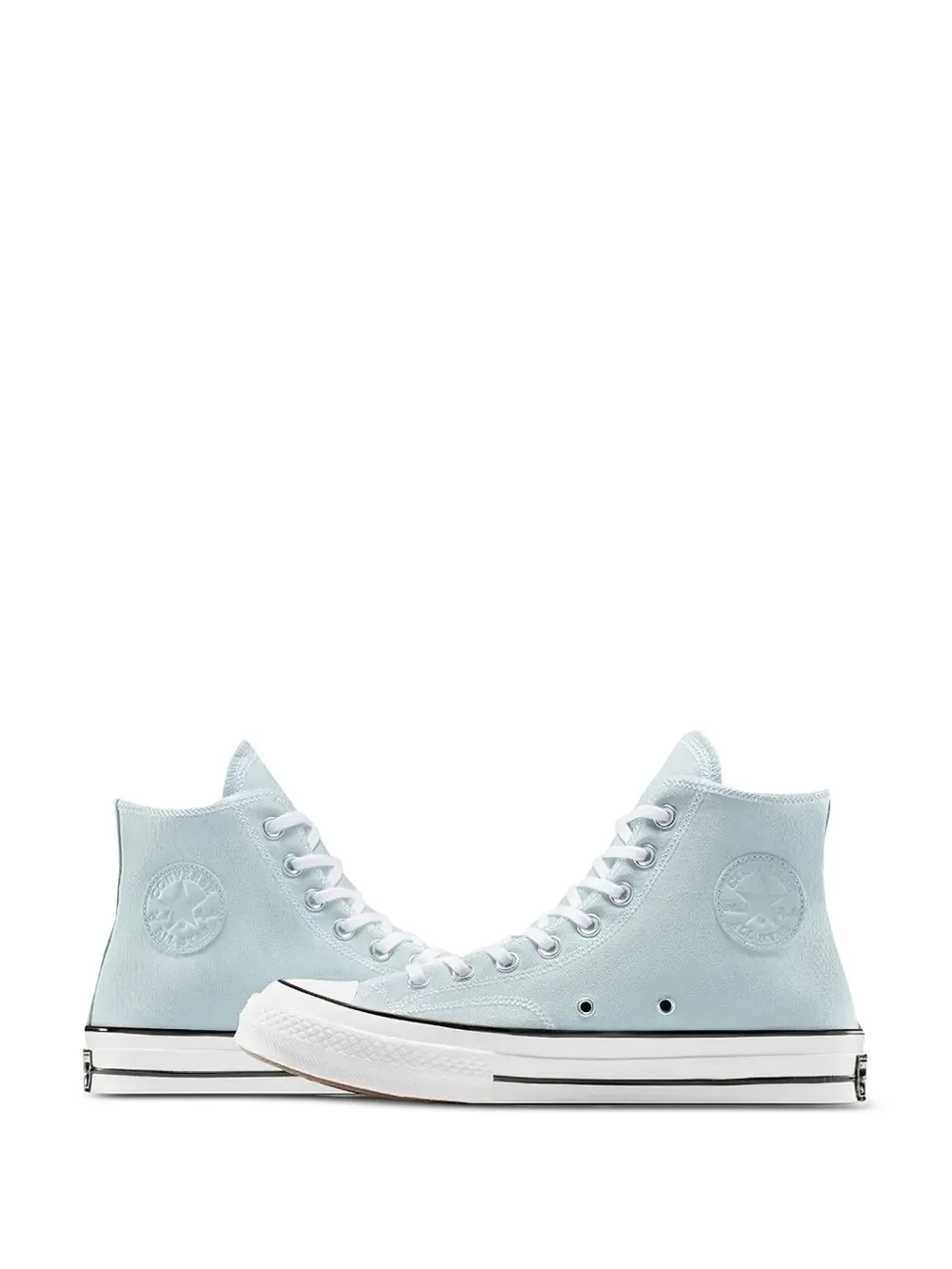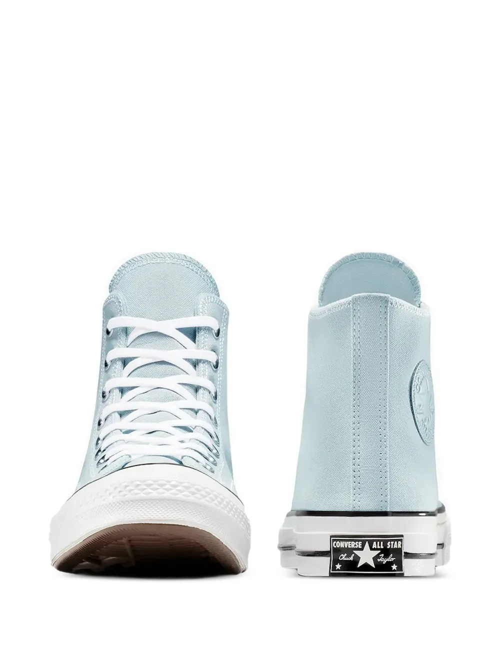Верх из светло-голубого парусина, резиновый носок, шнуровка, мягкий воротник, подошва из вулканизированной резины.
