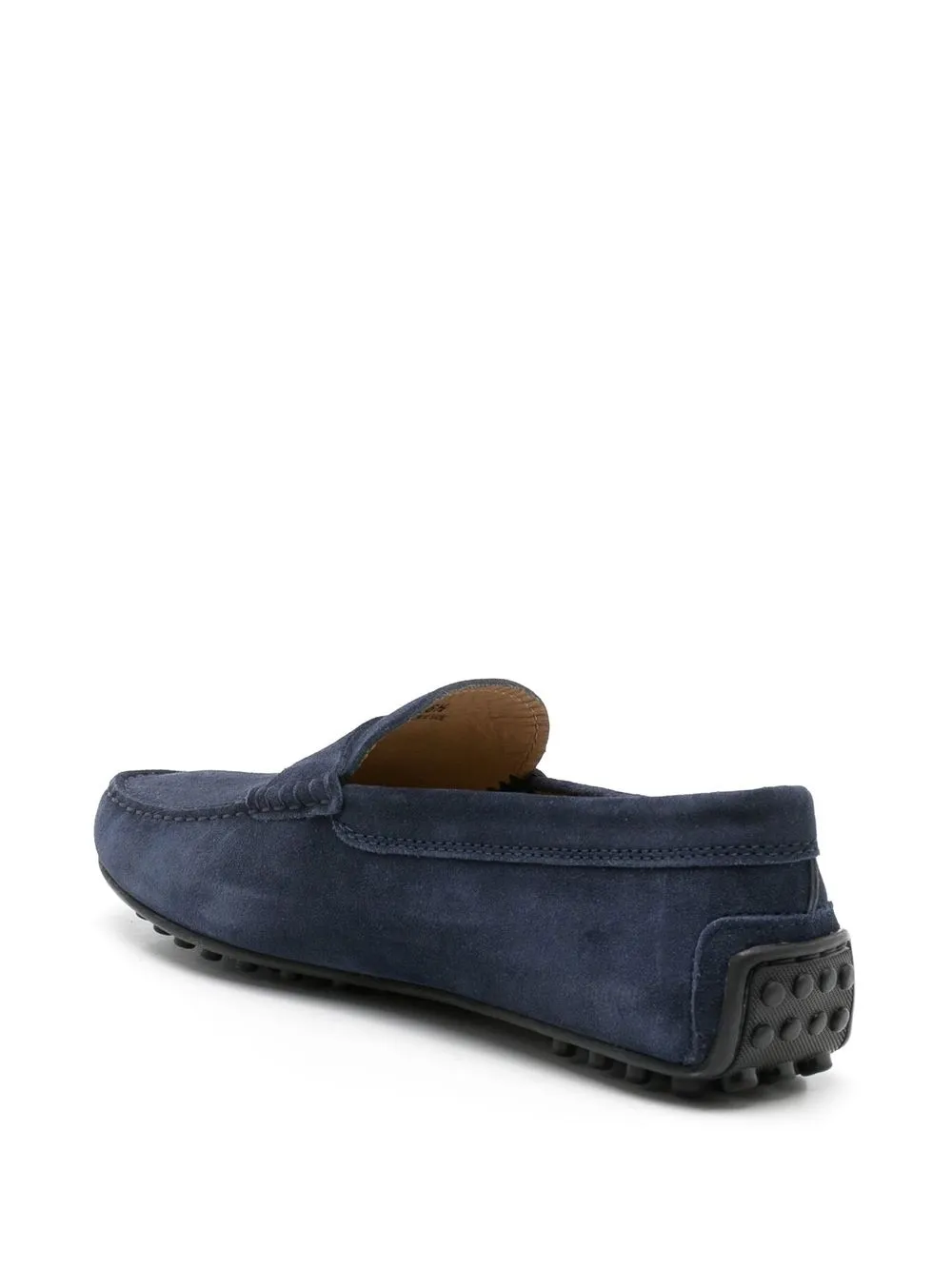Темно-синий, замша, тисненый логотип спереди, стелька с логотипом, закругленный носок, модель без застежки и плоская резиновая подошва.
