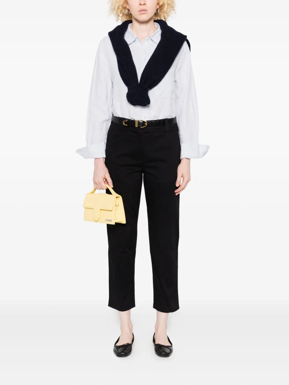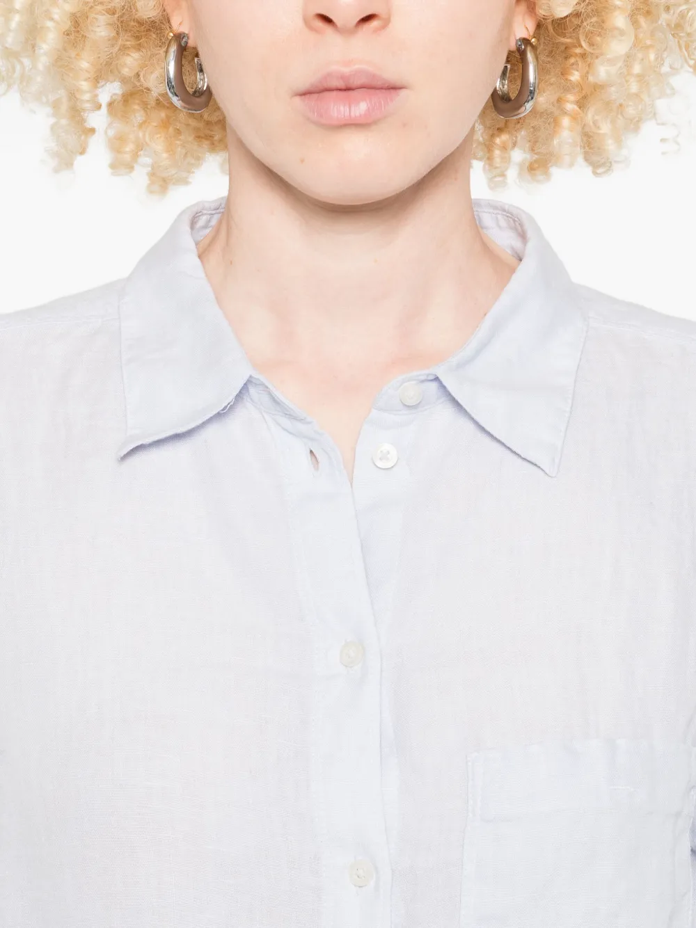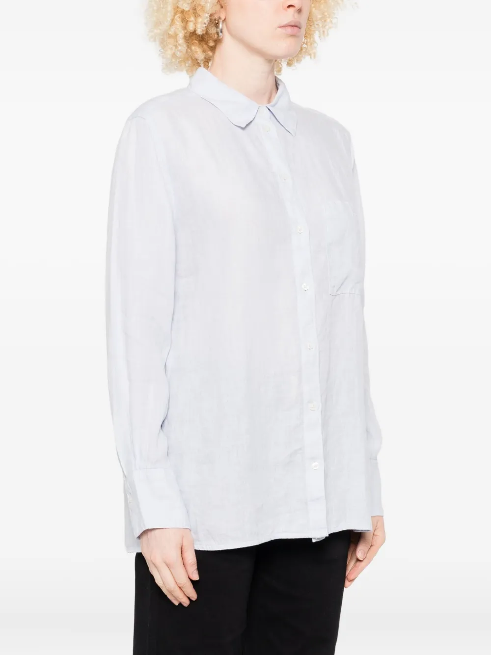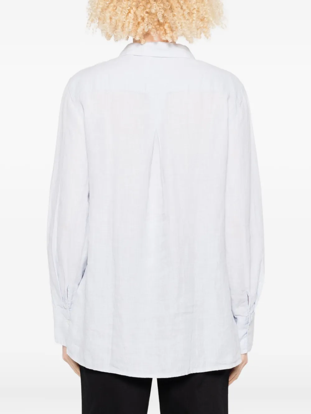 Светло-голубой классический воротник, застежка на пуговицы, один нагрудный карман, длинные рукава, лен