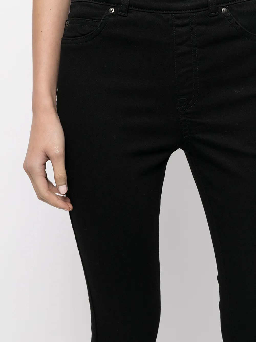 Tecido com stretch, средняя посадка, облегающий крой, эластичный пояс, петли для ремня и классическая пятикарманная модель. Цвет: черный.