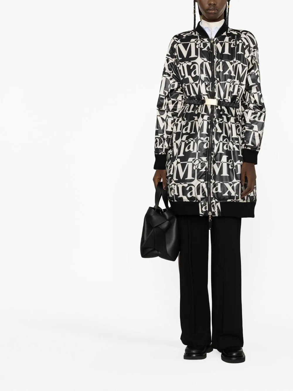 Черный/белый, смесовая необработанная шерсть, сплошной принт с логотипом, бейсбольный воротник, застежка на молнии спереди, ремень на талии, длинные рукава, эластичные манжеты, эластичный подол и длина миди.