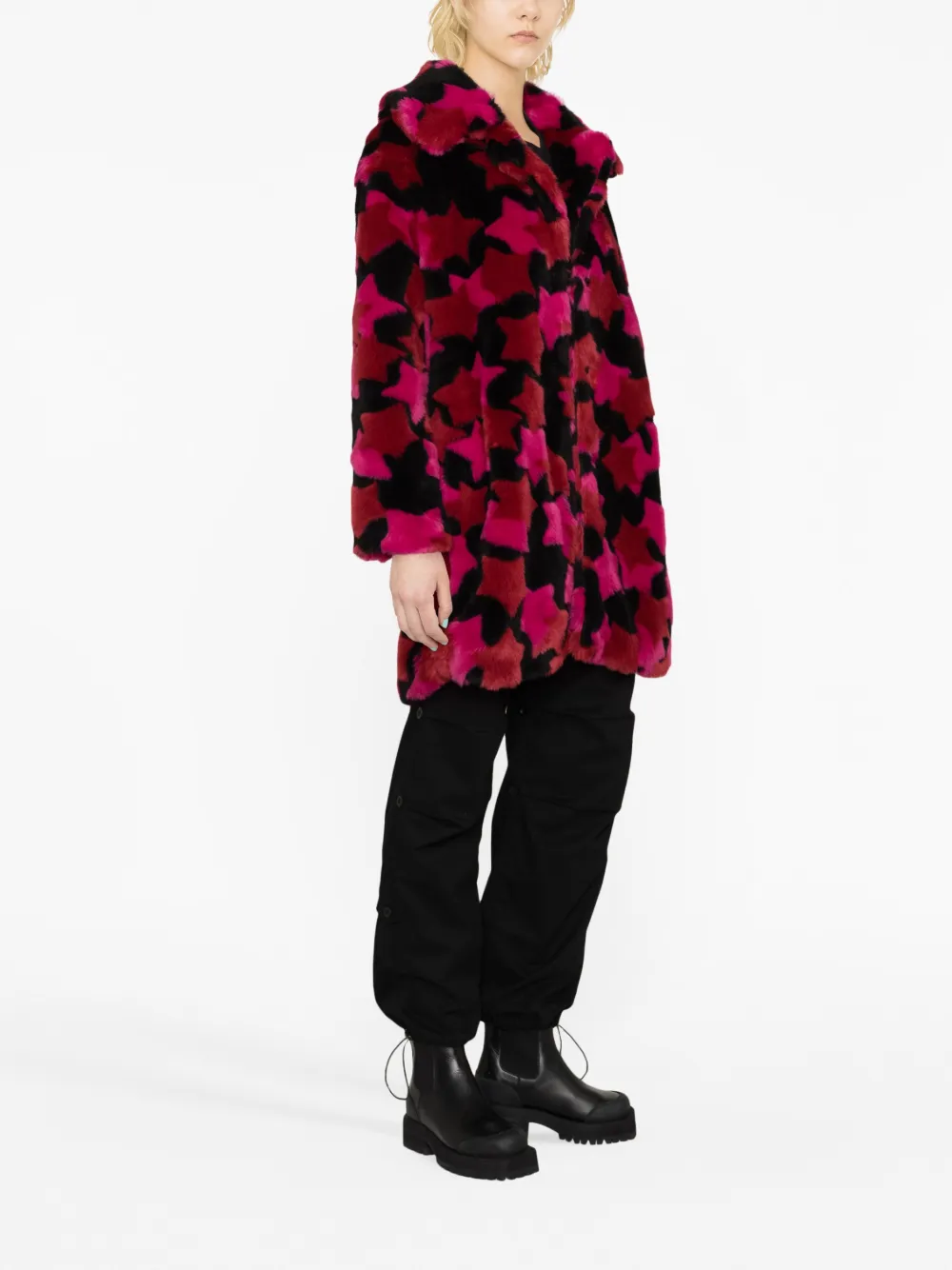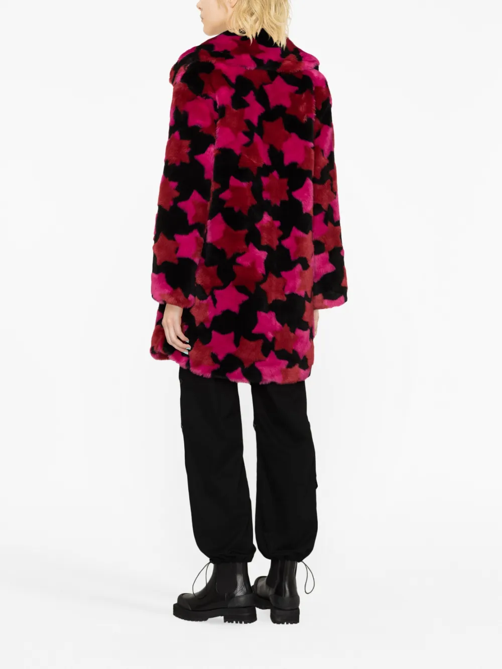Черный, темно-красный, темно-розовый, искусственный мех, принт с изображением звезд, лацканы-шалька, потайная пуговичная застежка спереди, длинные рукава и прямой подол.