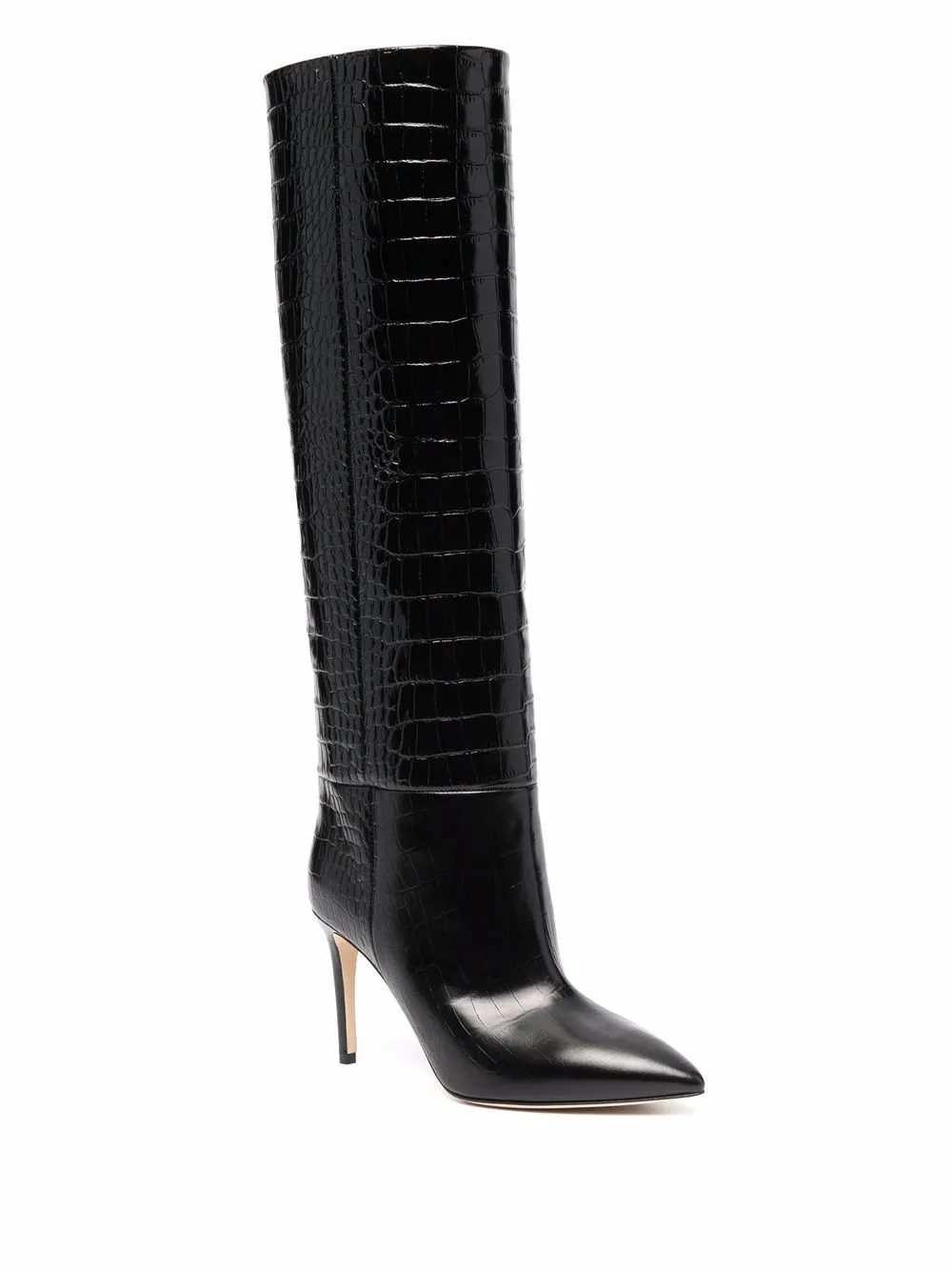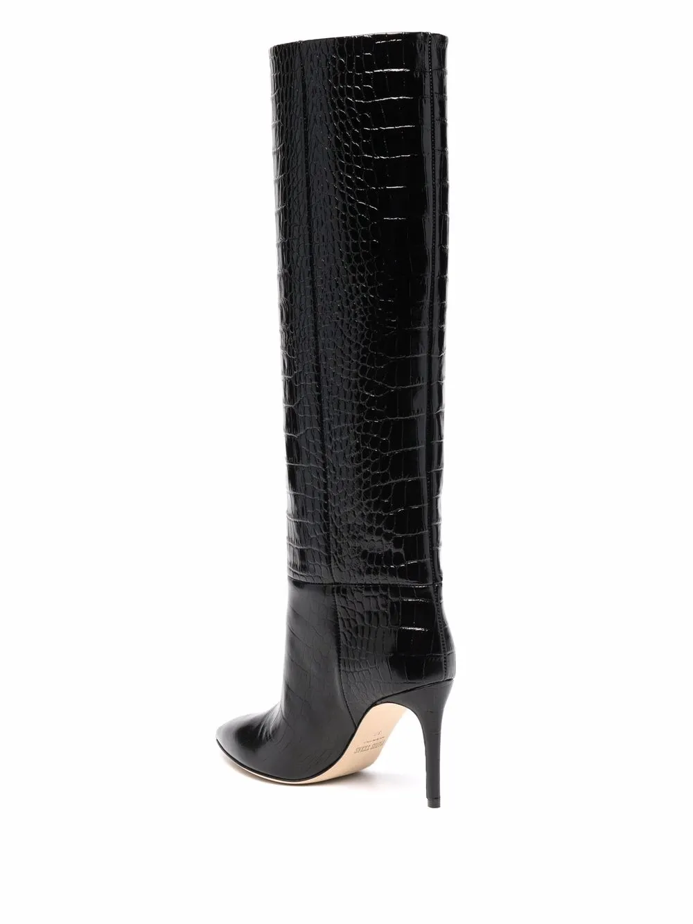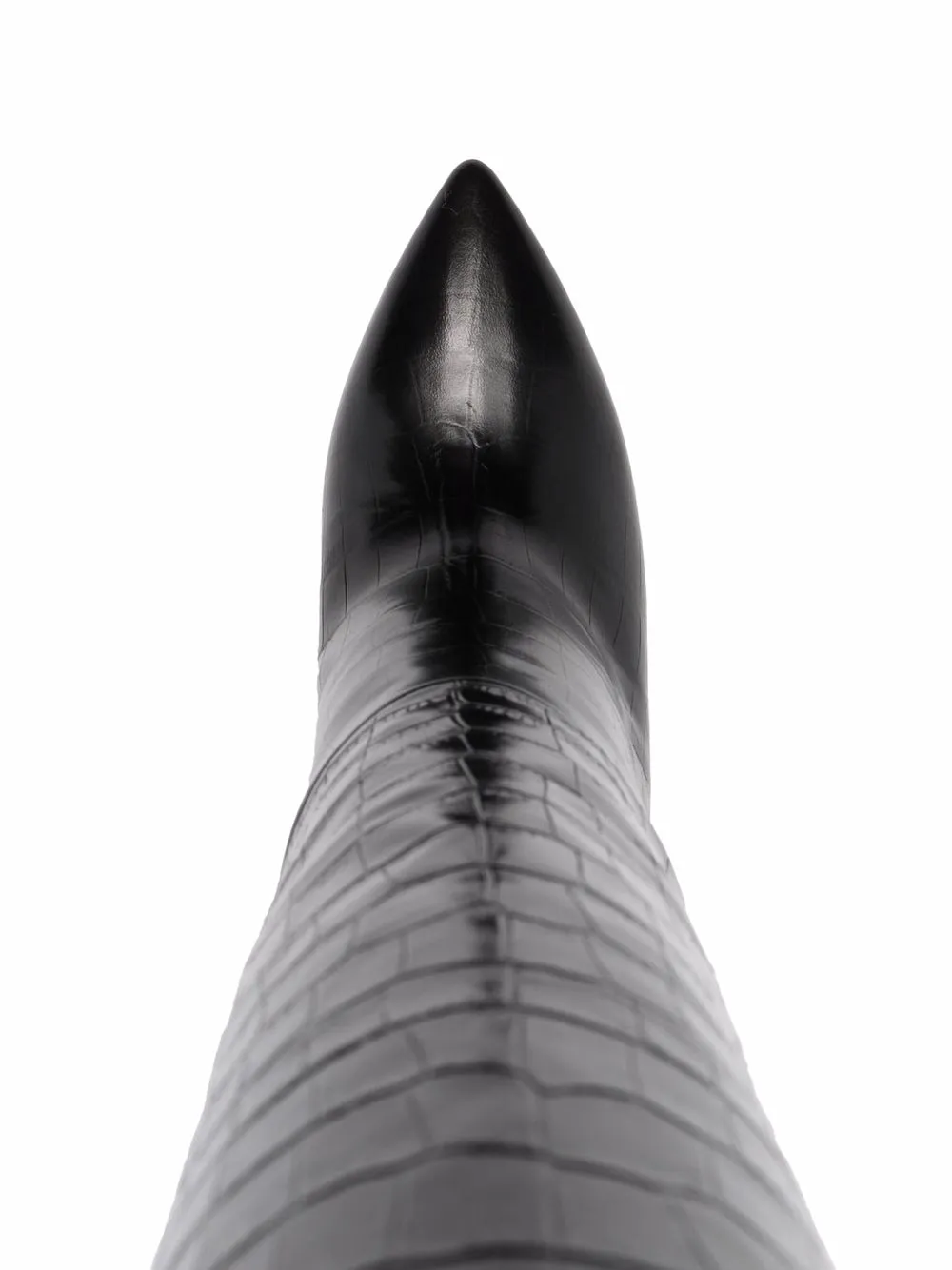 Тиснение под кожу крокодила, каблук на высокой шпильке, длина ниже колена, заостренный носок, кожаная стелька с логотипом, кожаная подошва и модель без застежки.