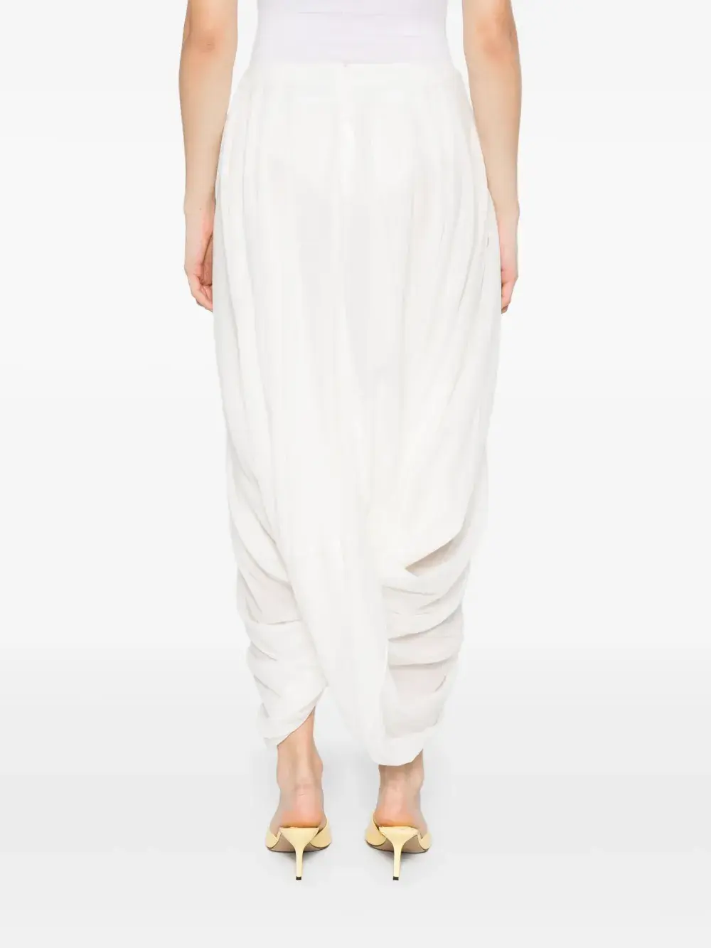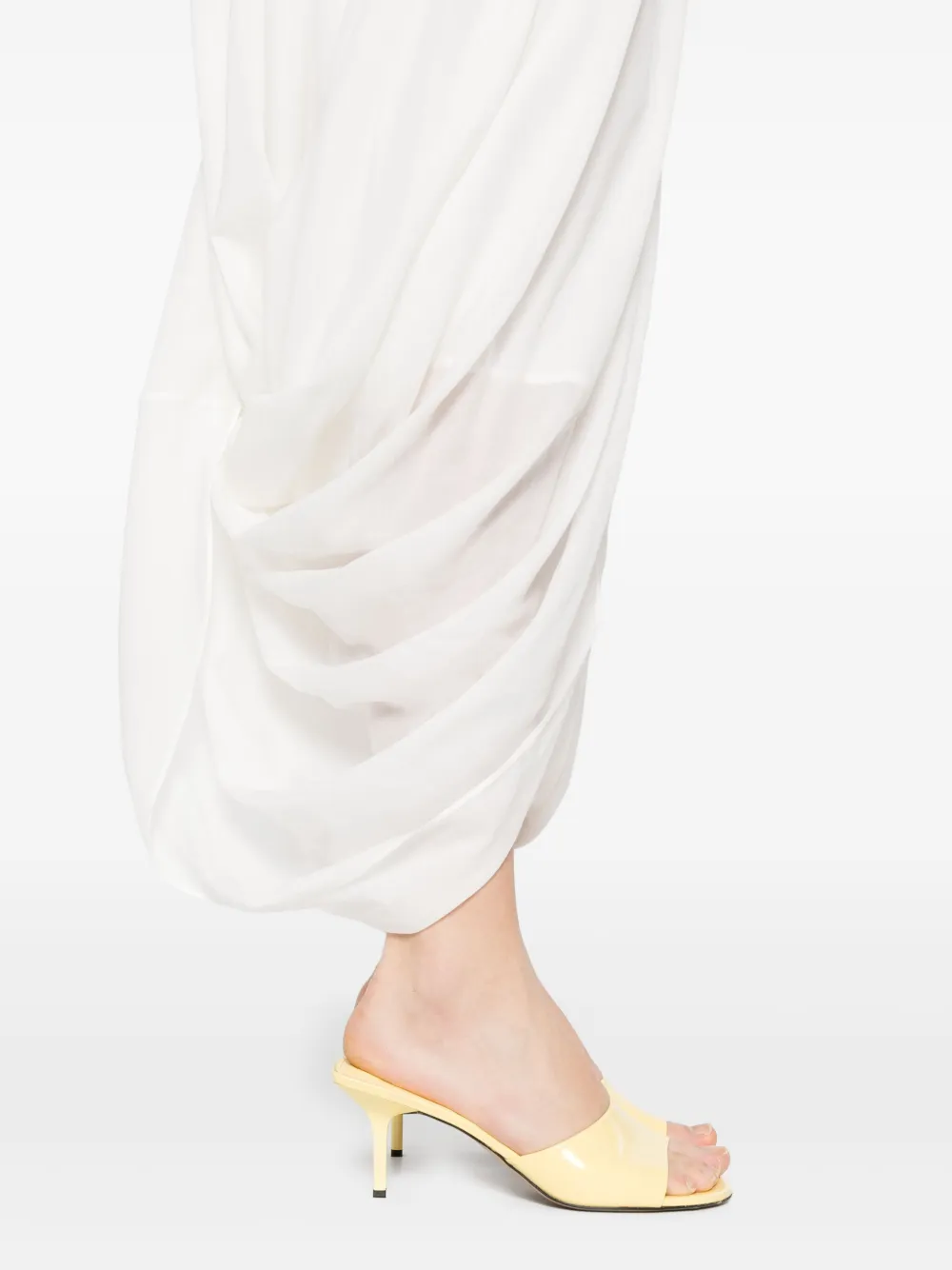 Белая потайная застежка-молния сзади, драпированный дизайн, асимметричный подол с высокой талией.