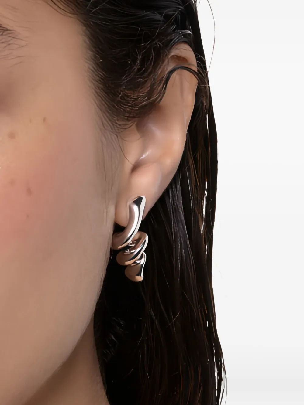Изготовлено из переработанного стерлингового серебра, изогнутая конструкция, трёхсекционная спиральная полированная отделка, застёжка-гвоздик. Обычное ежедневное использование и воздействие внешних факторов могут уменьшить блеск драгоценных камней и золотых поверхностей. Для ухода используйте специальные неабразивные средства, предназначенные для чистки ювелирных изделий. Это одна серьга.