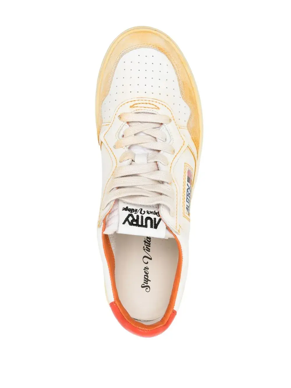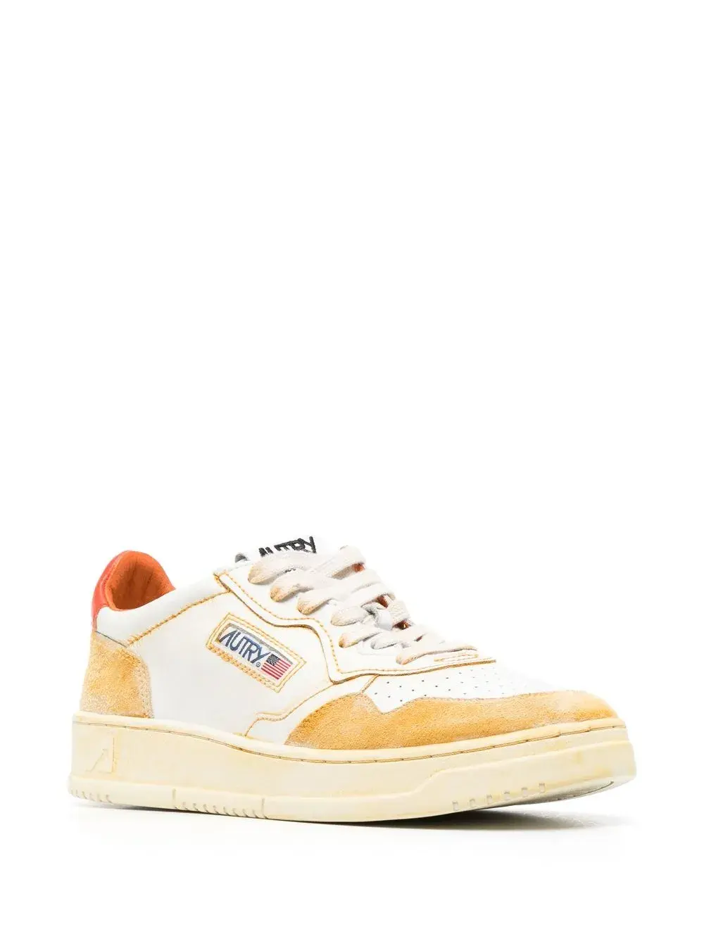 Белый, оранжево-желтый, янтарно-оранжевый, телячья кожа, дизайн колор-блок, нашивка с логотипом на язычке, нашивка с логотипом сбоку, перфорированный носок, контрастный задник с логотипом, закругленный носок, шнуровка спереди и плоская резиновая подошва.