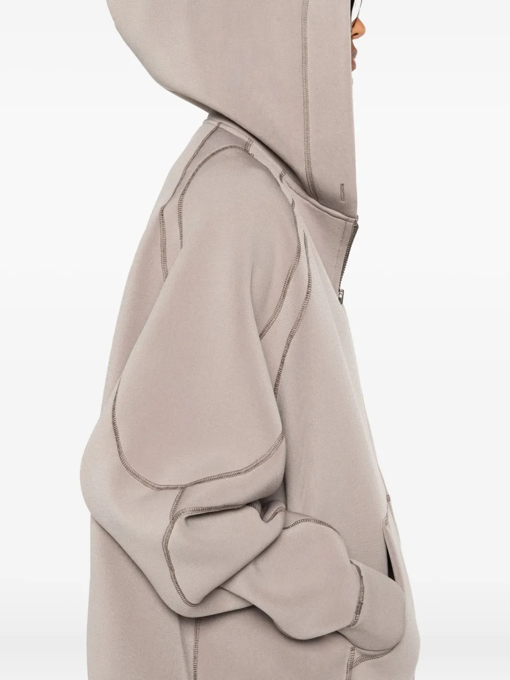 Нейтральные тона, капюшон, застежка-молния, длинные рукава.