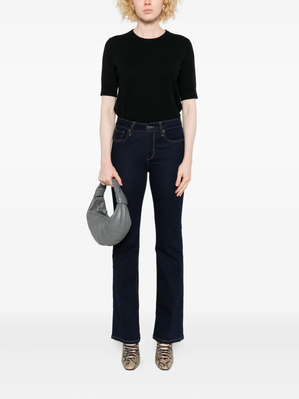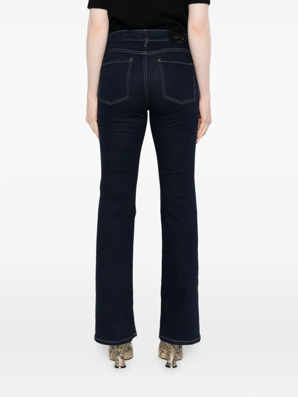 Темно-синий фасон с пятью карманами, застежкой на пуговицы, шлевками для ремня и контрастной строчкой.