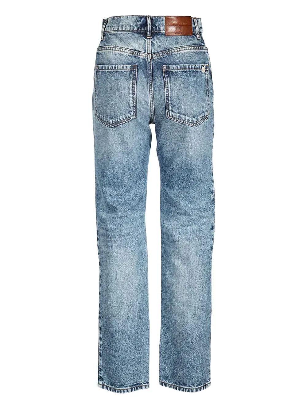 Светло-голубой, пять карманов, контрастная строчка, пуговицы, кожаная нашивка, выцветшая стирка