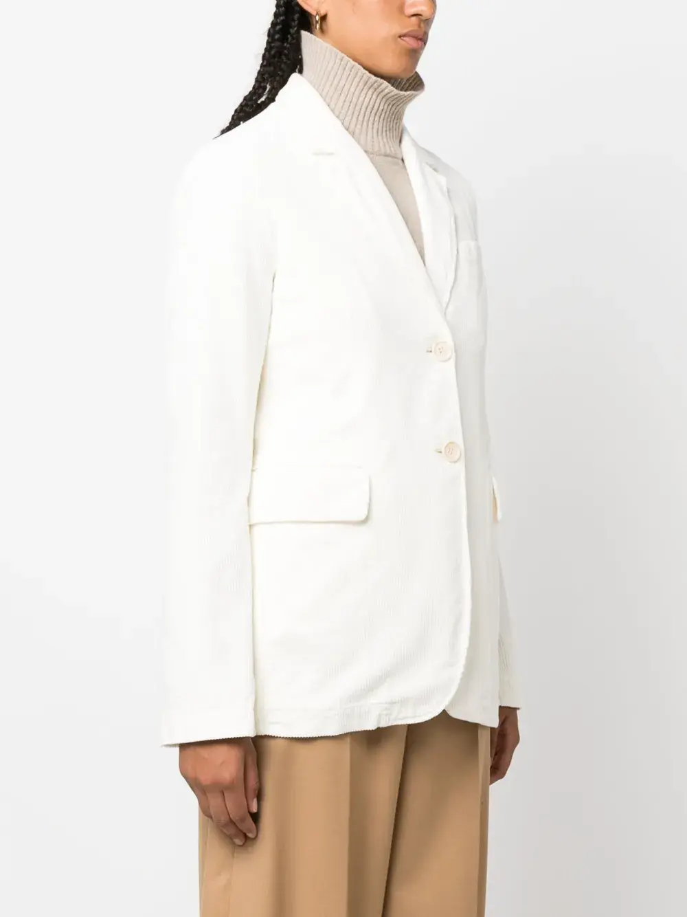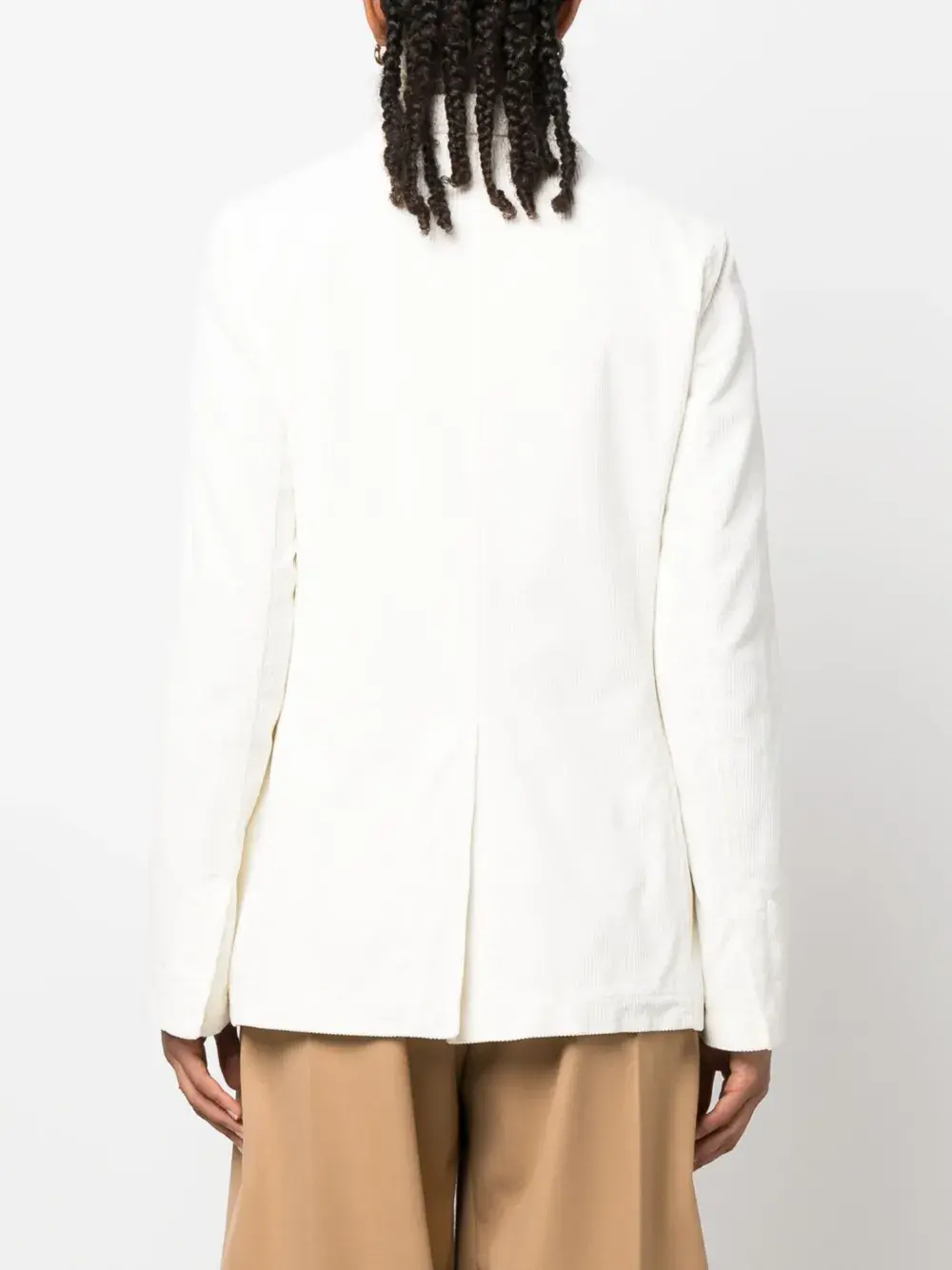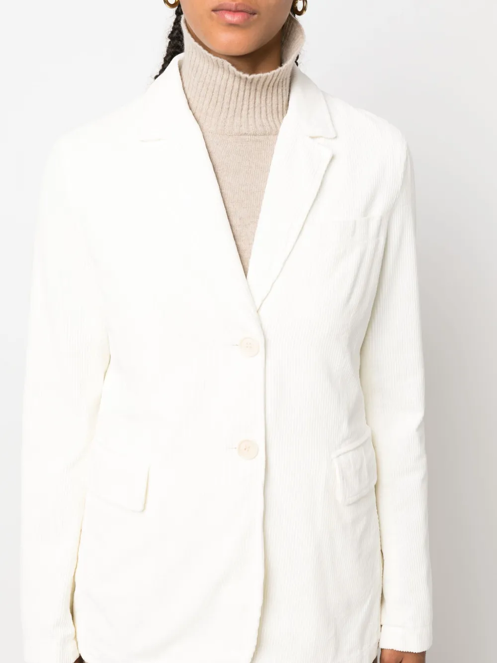Белый, вельветовый материал, зазубренные лацканы, застежка на пуговицах спереди, нагрудный накладной карман, два передних кармана с клапанами, длинные рукава, вырез сзади, закругленный подол и прямой подол.