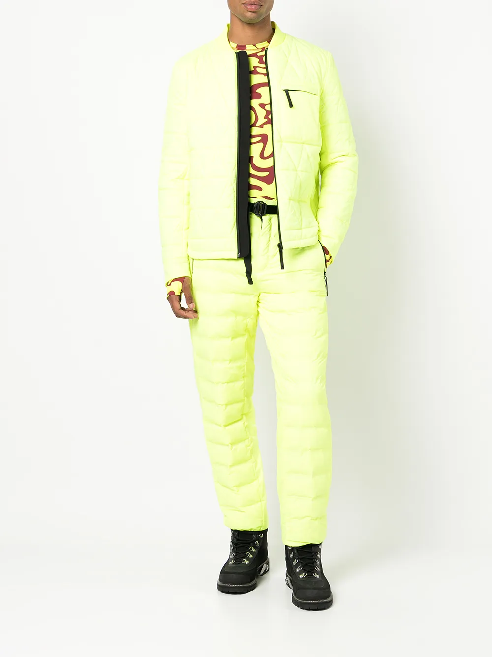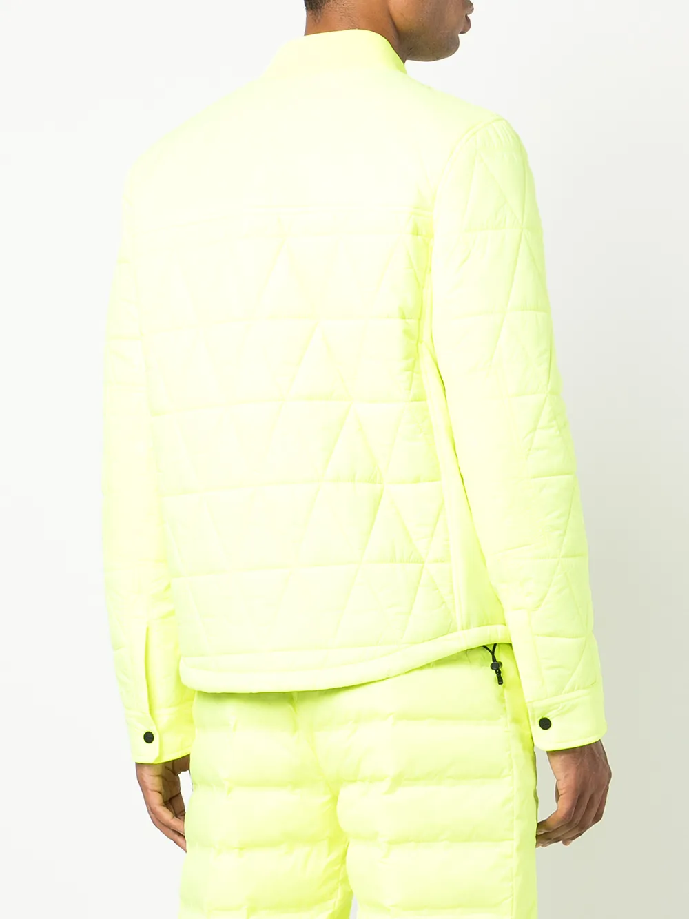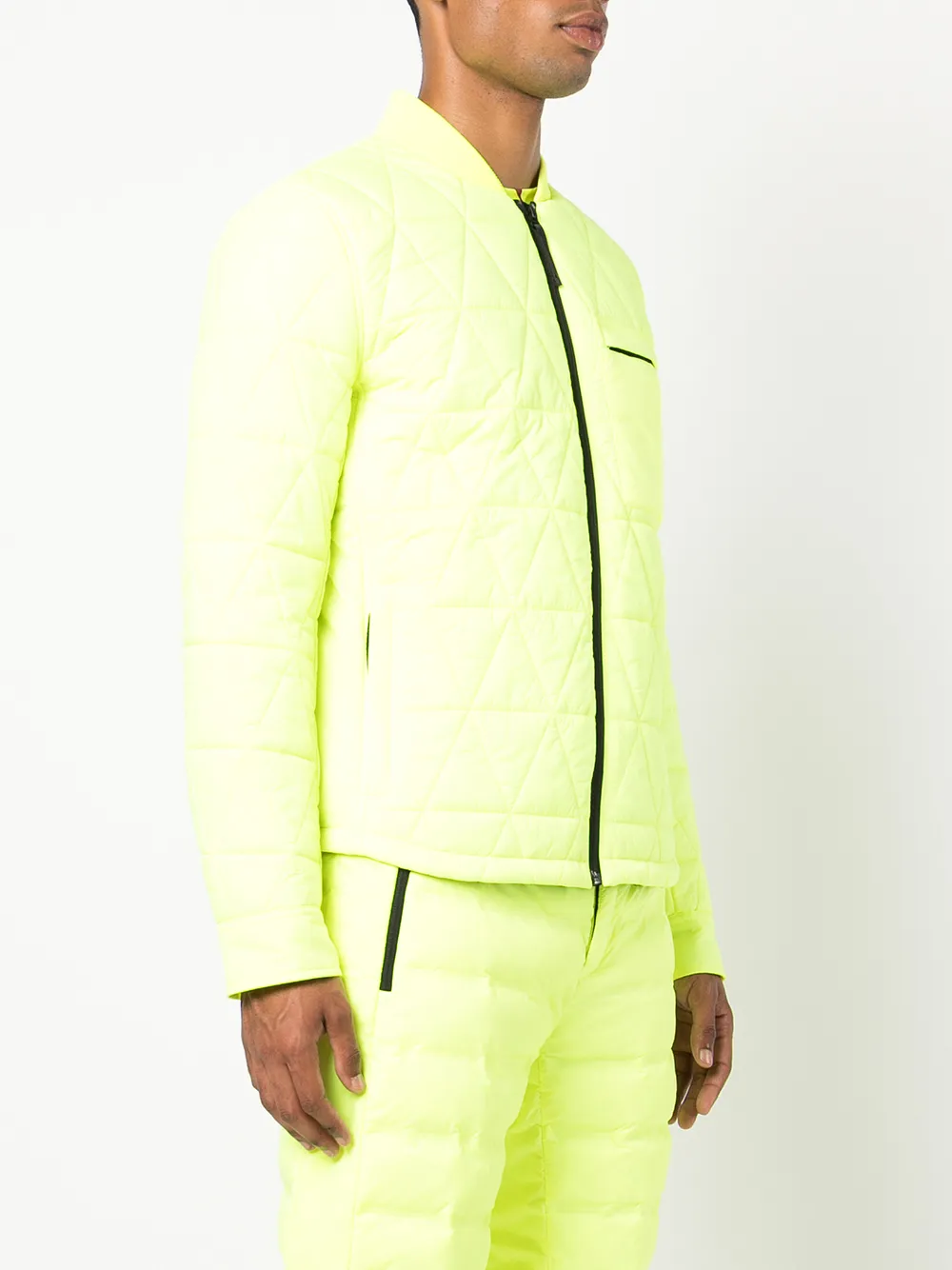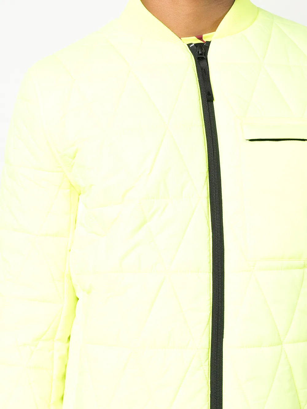 Воротник-стойка в рубчик, стеганый материал, дутый материал, застежка на молнии спереди, два нагрудных кармана на молнии и два прорезных кармана сбоку.