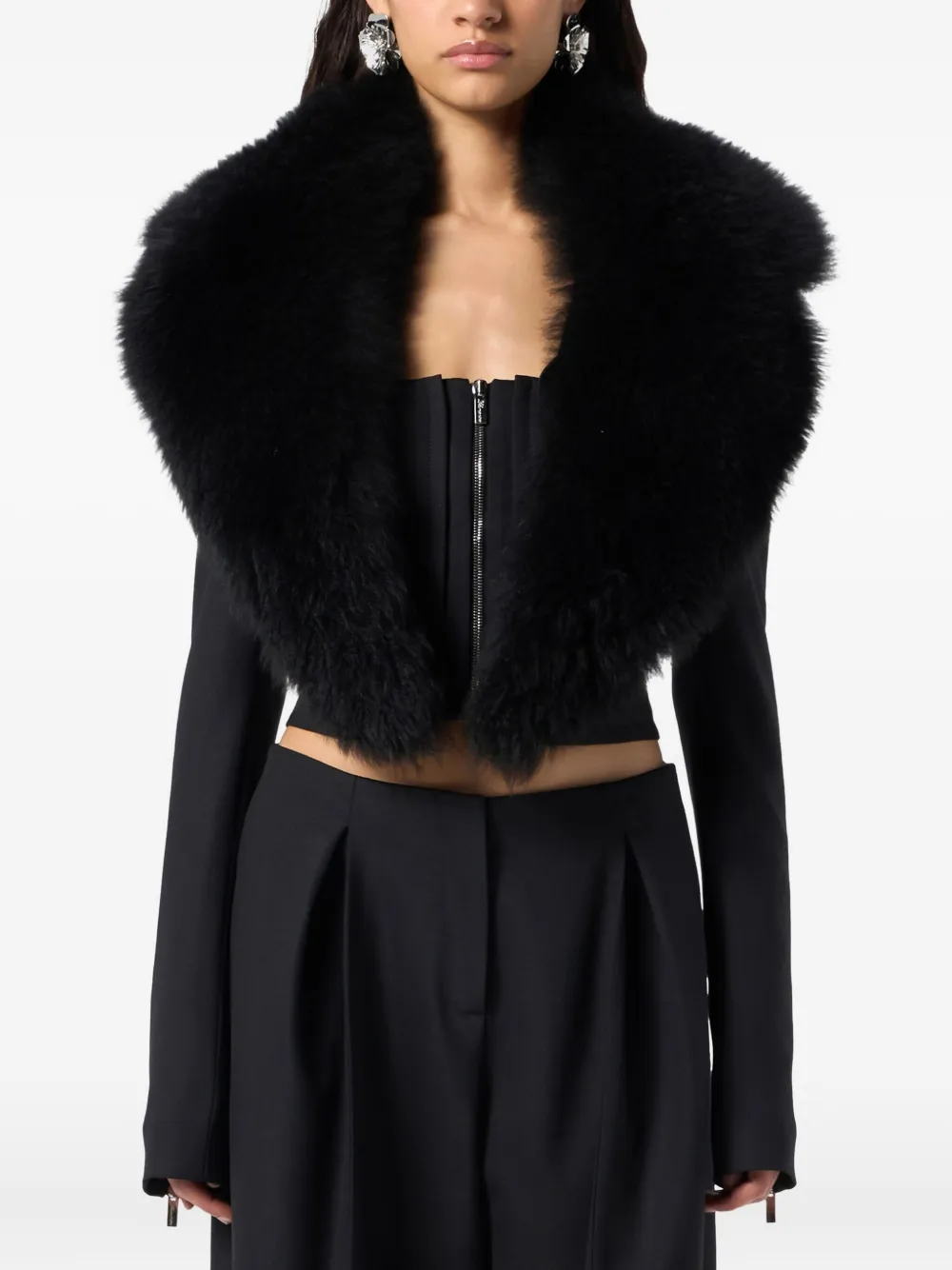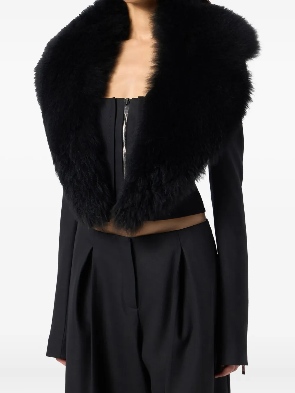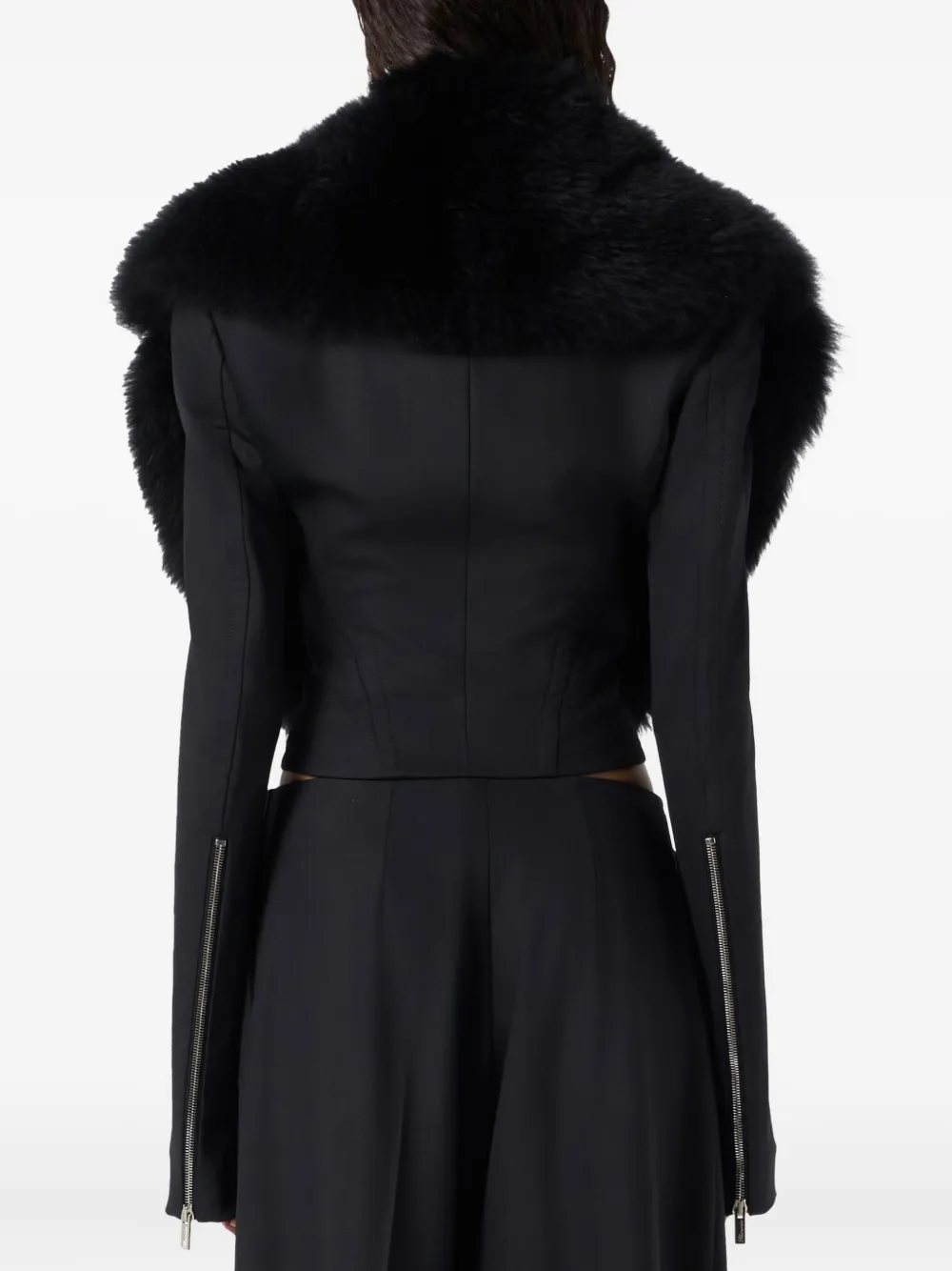 Черный воротник из овчины, застежка-молния спереди, длинные рукава, укороченная длина