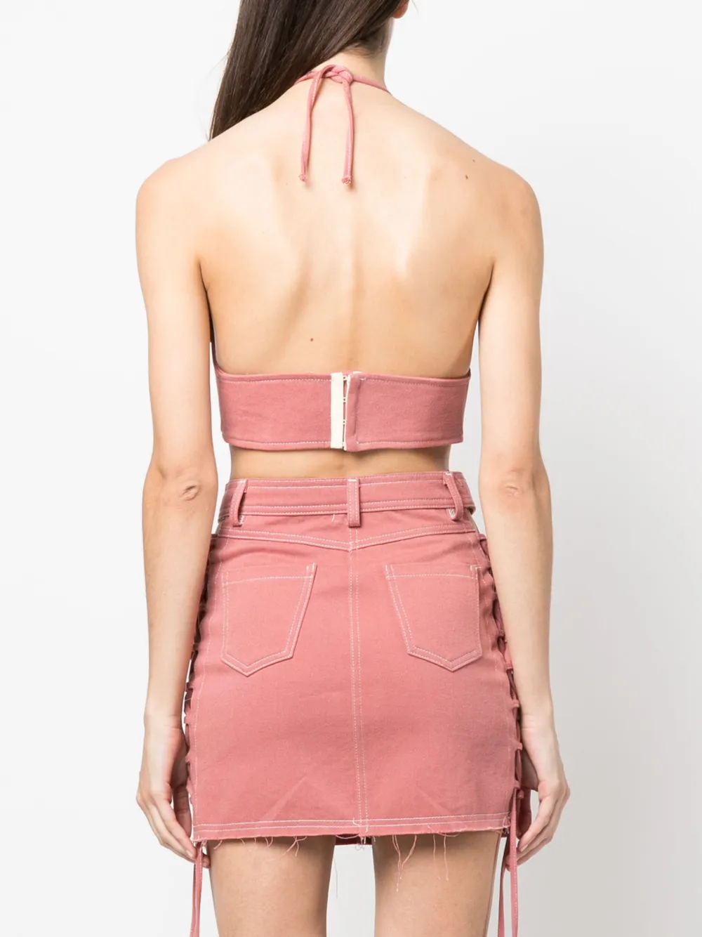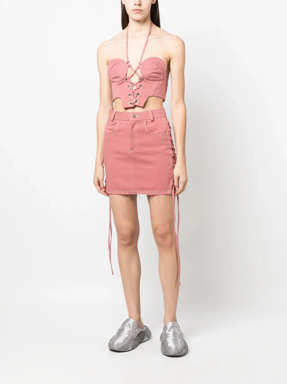 Розовый, хлопок, отделка металлическими люверсами, верх в корсетном стиле, завязки вокруг шеи, шнуровка спереди, застежка на крючок сзади, лиф в стиле бюстье, без рукавов и укороченная длина.