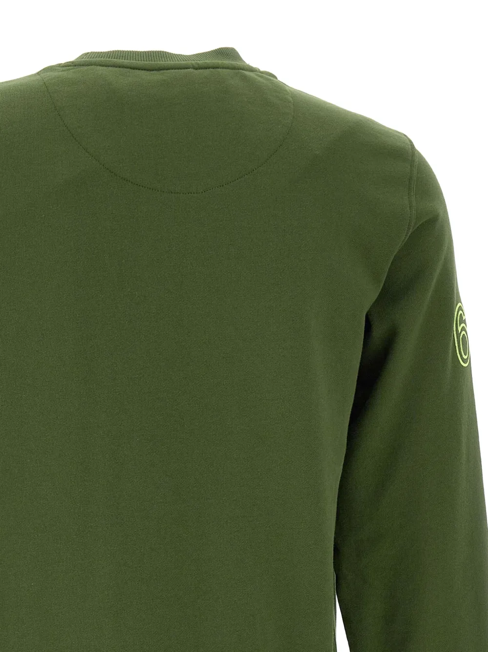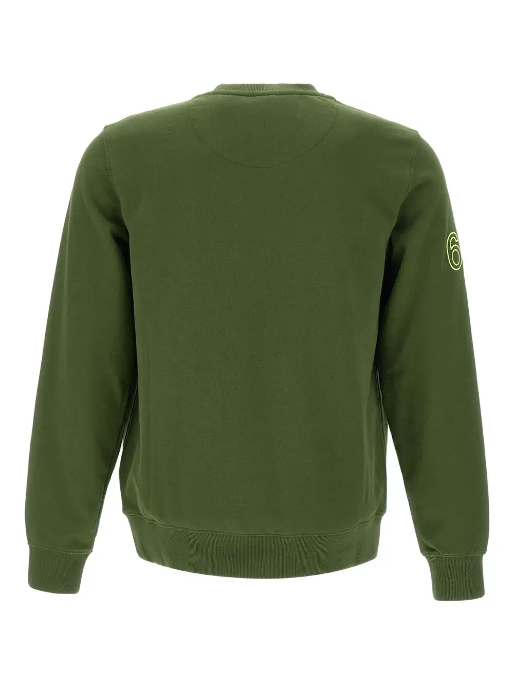 Зеленый вышитый логотип на груди, круглый вырез горловины, длинные рукава, ребристый подол и манжеты.