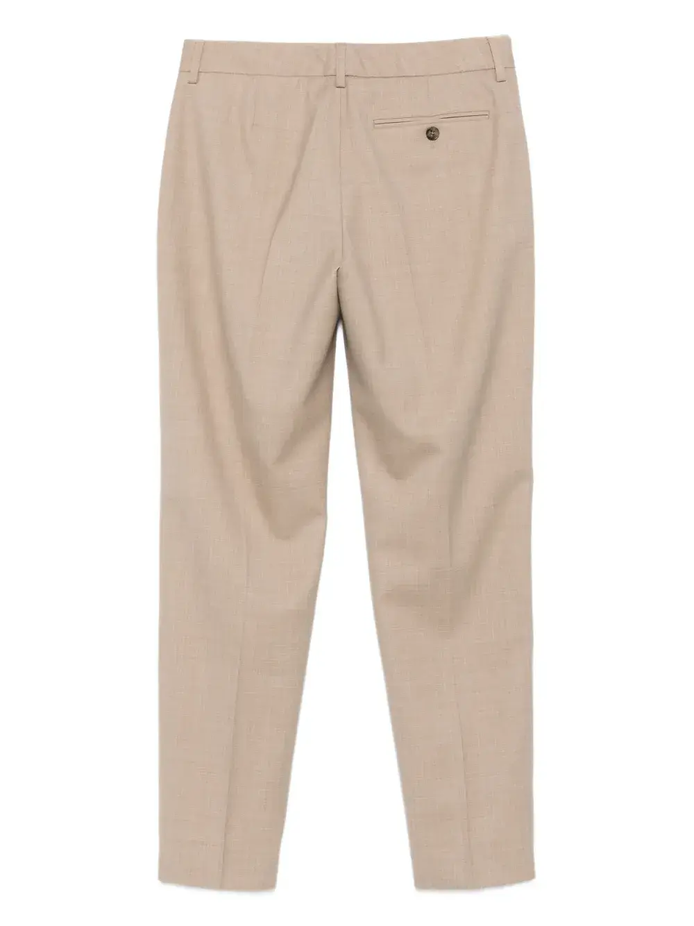 Бежевые брюки прямого кроя со средней посадкой, застежкой на пуговицы, передними карманами и задними карманами.