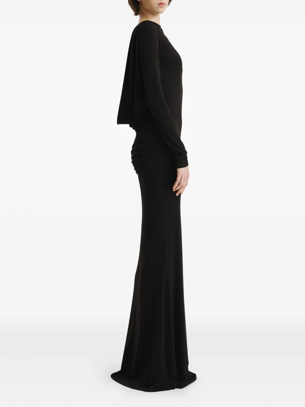 Черный воротник-хомут, длинные рукава, облегающий лиф.