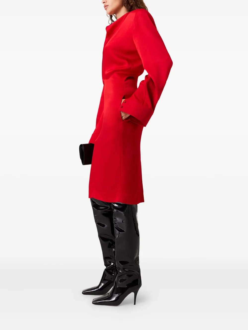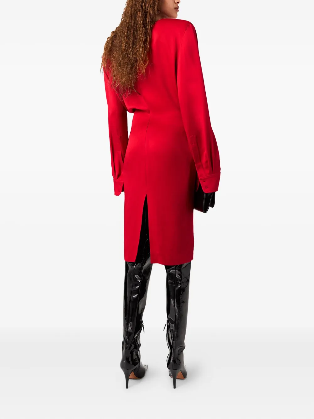 Красный воротник-хомут, драпированный лиф, длинные рукава, шлица по центру сзади.