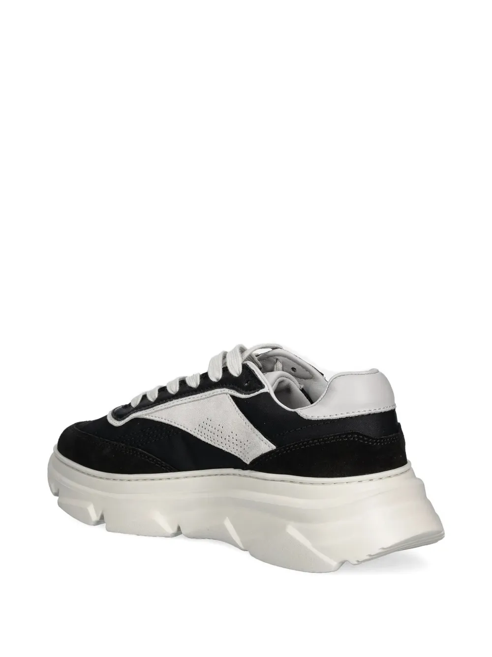Черные замшевые вставки, кожаные вставки, перфорированные детали, шнуровка, массивная резиновая подошва.