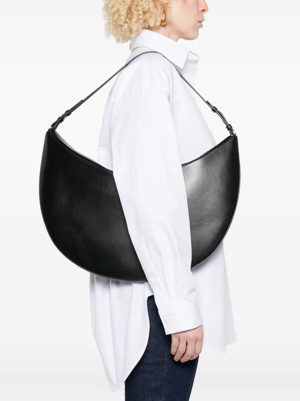 Черная кожаная сумка в форме полумесяца с одной верхней ручкой и золотистой пластинкой с логотипом