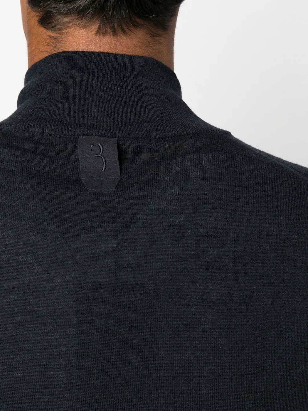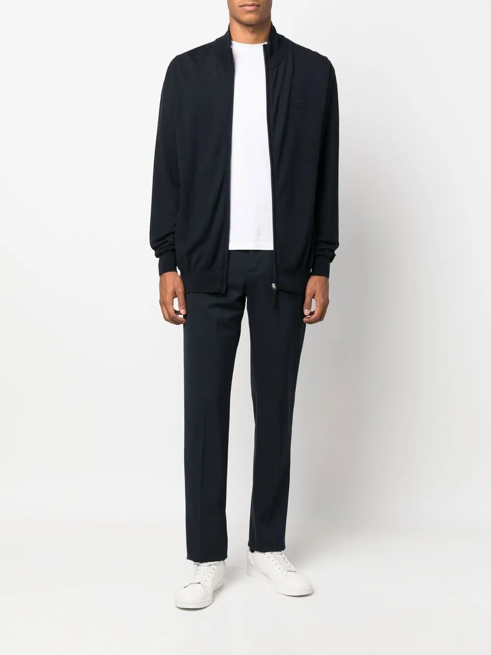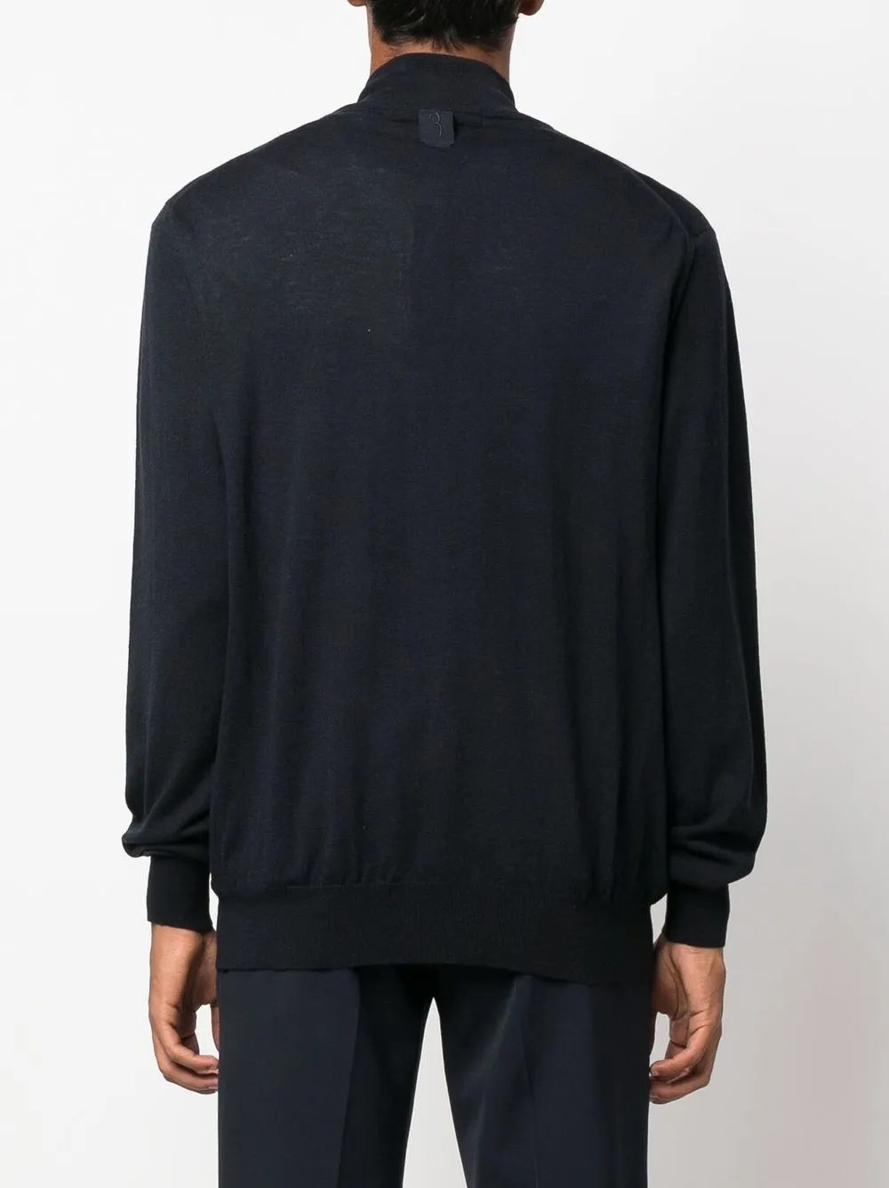 Темно-синий, смесь шерсти и кашемира, тонкая вязка, вышитый логотип на груди, детали в рубчик, застежка на молнии спереди, длинные рукава и прямой подол.