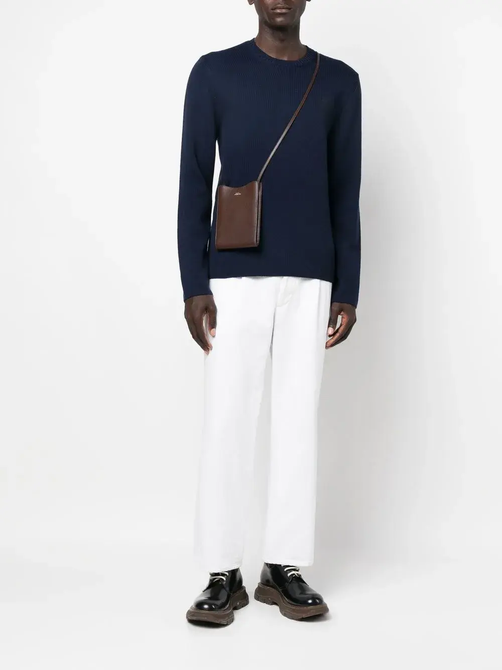 Темно-синий, необработанная шерсть, круглый вырез, длинные рукава и рукава с узкими манжетами.