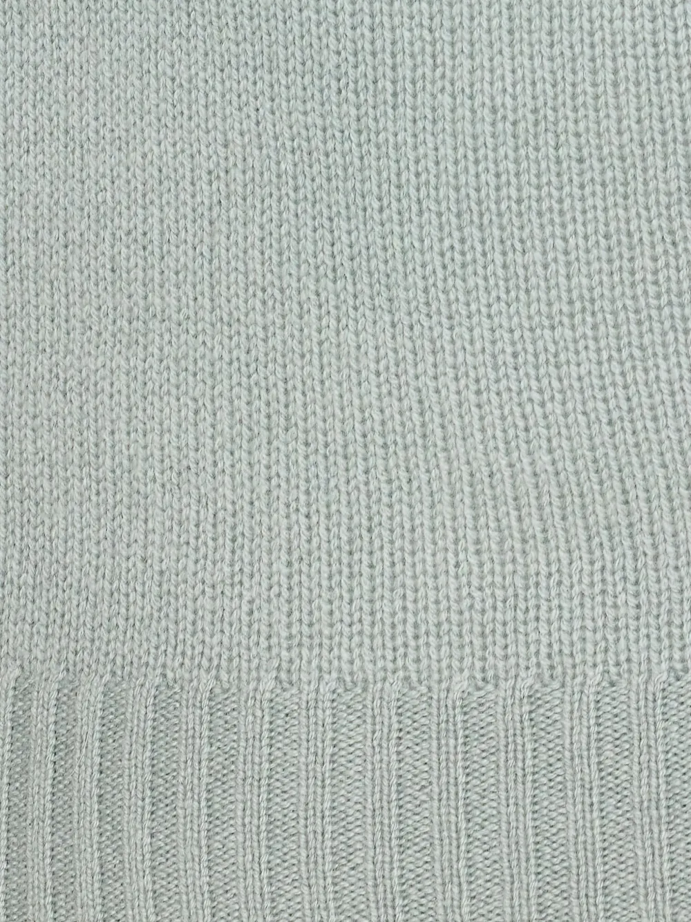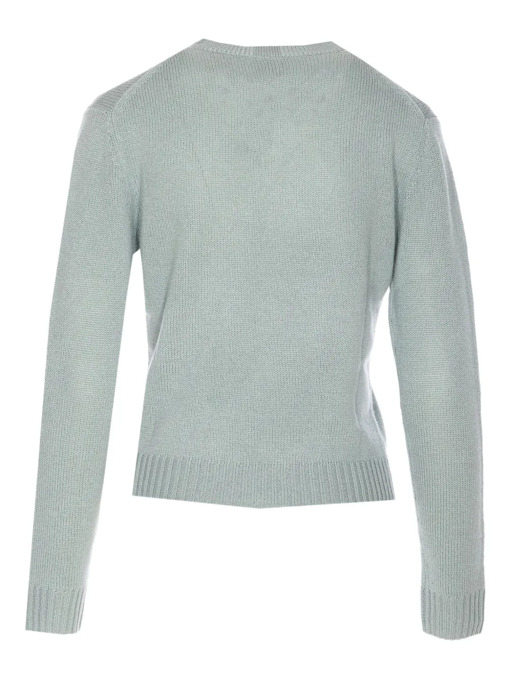 Синяя кашемировая ткань, круглый вырез горловины, длинные рукава, ребристый подол и манжеты.