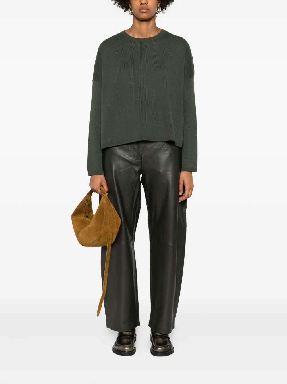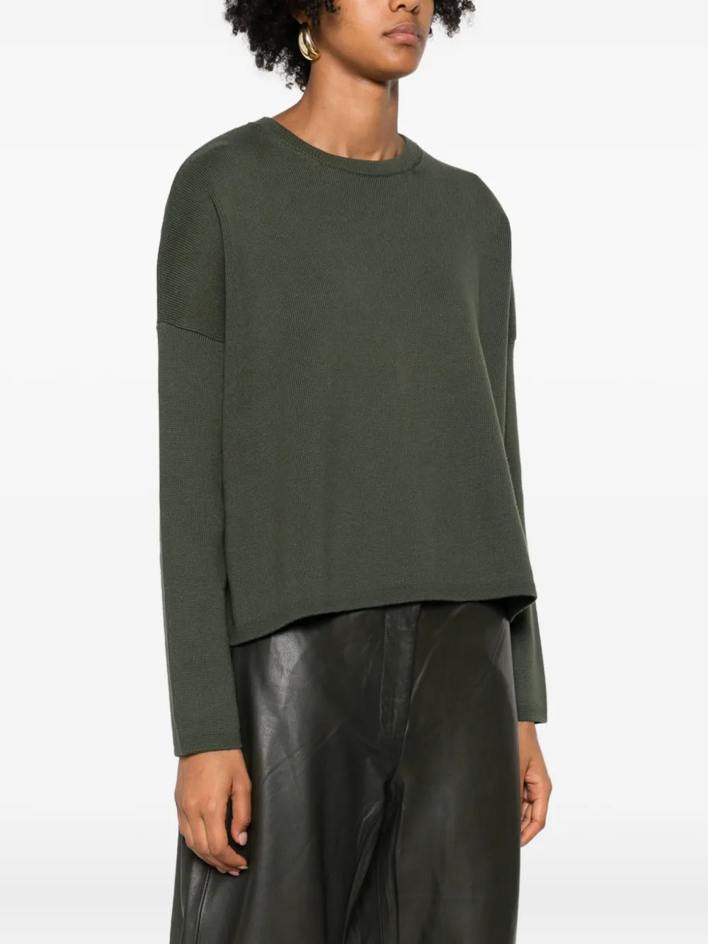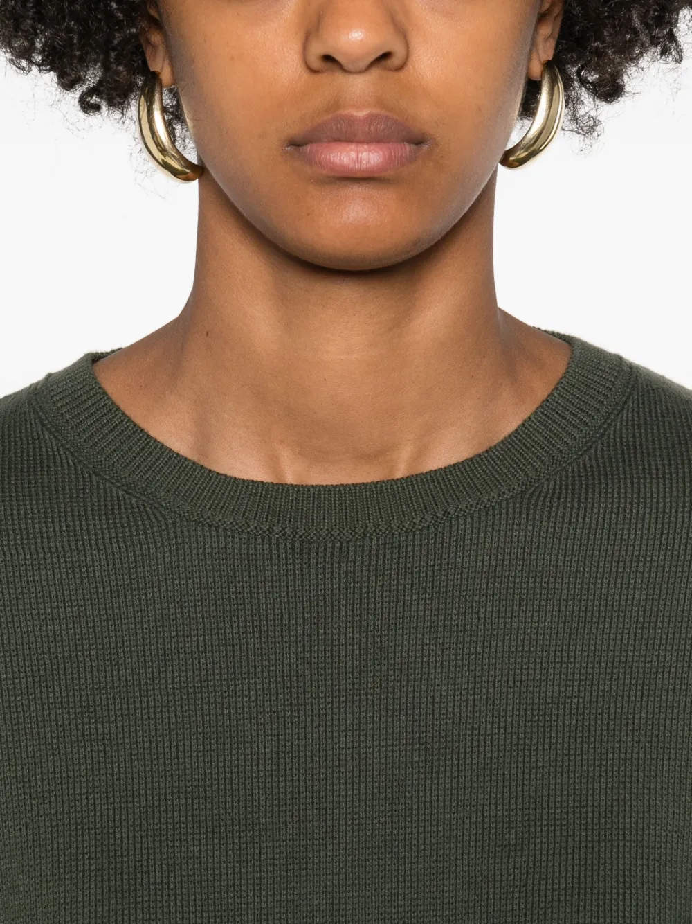 Зеленый круглый вырез горловины, ребристая фактура, длинные рукава, прямой подол.