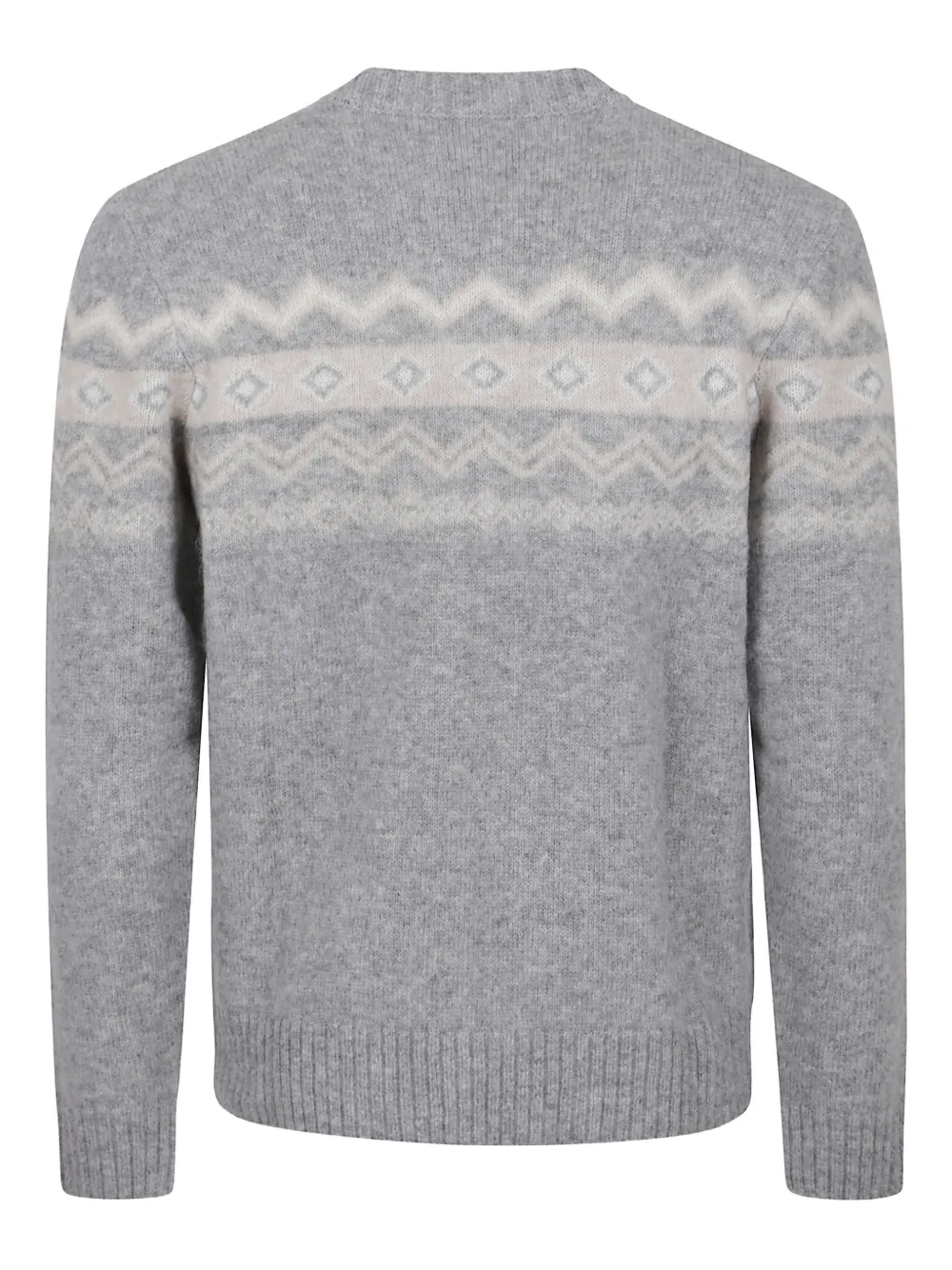 Серый фасон с узором «фэр-айл», круглый вырез горловины, длинные рукава, ребристый подол, ребристые манжеты.
