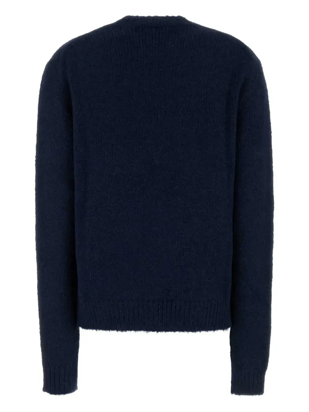 Темно-синяя альпака, шерстяная смесь, круглый вырез горловины, длинные рукава, необработанный край.