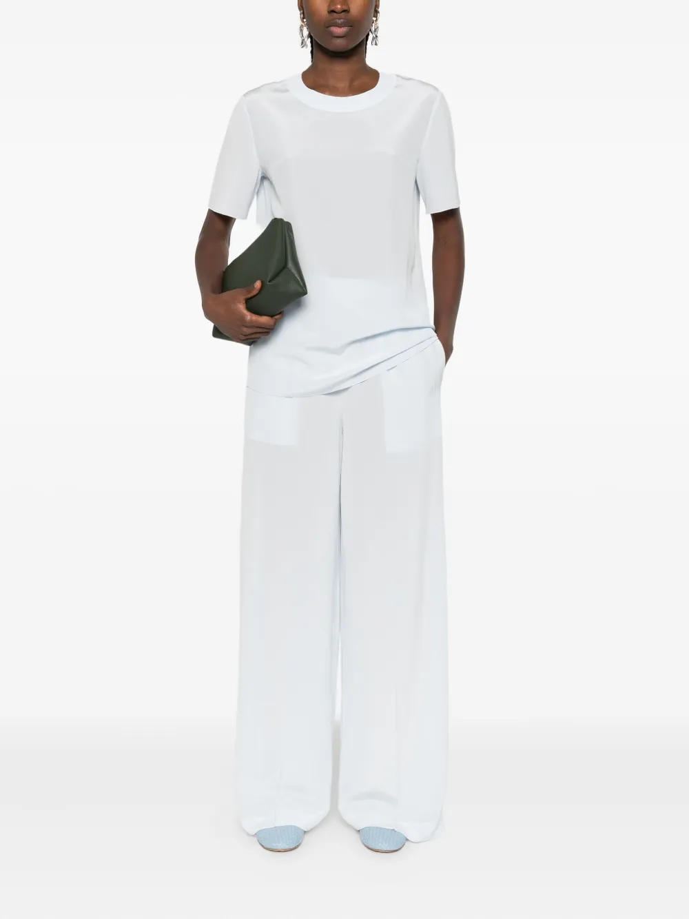 Белый шёлк с круглым вырезом, короткими рукавами и прямым подолом.
