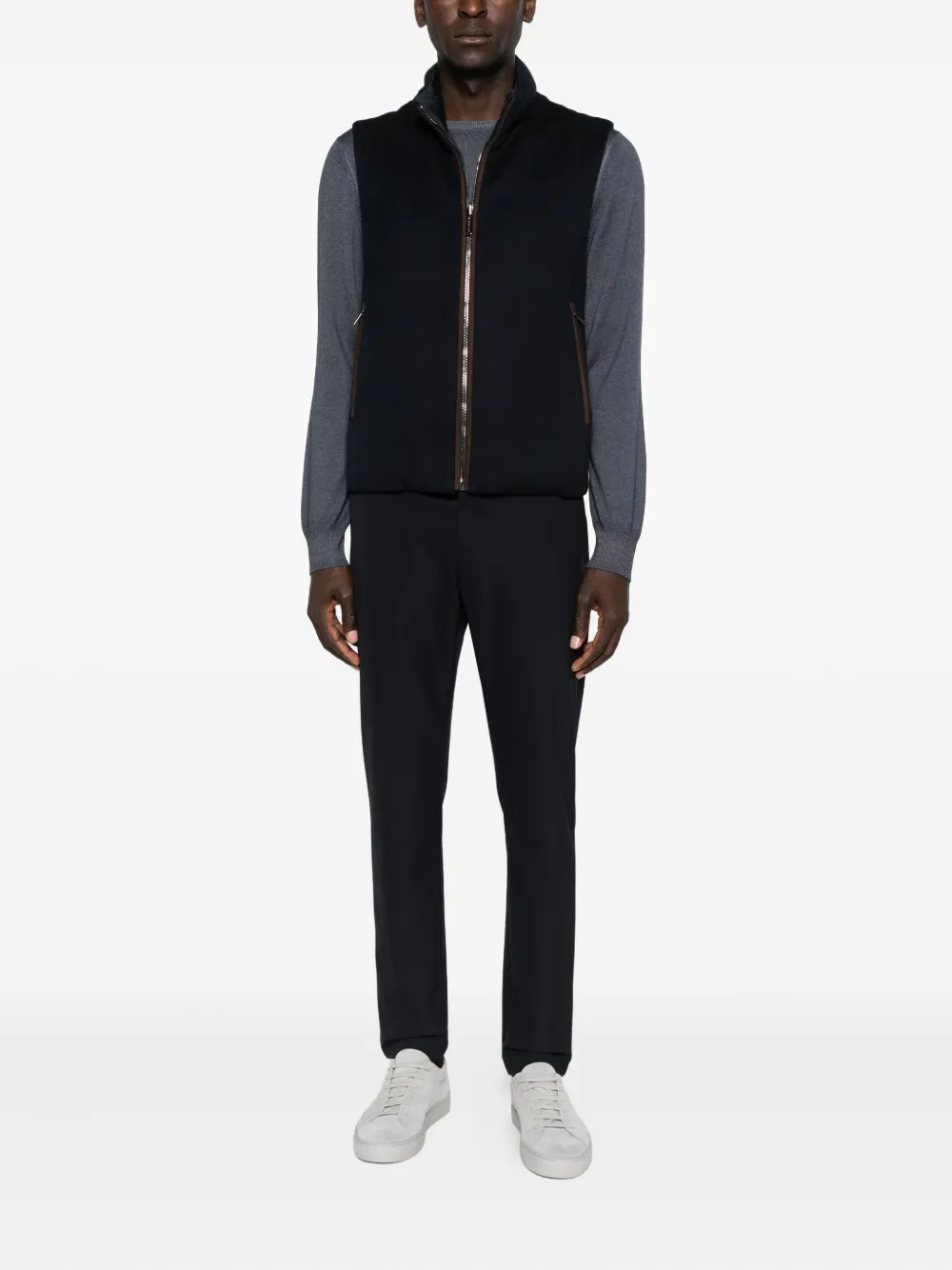 Длинные рукава из темно-серой шерсти, ребристые манжеты.